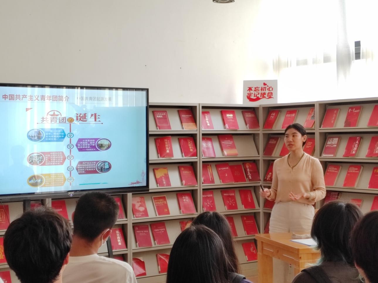 4月17日下午5:00,何敏芝老师在图书馆三楼“红色阅读角”举办红色知识专题讲座,本期讲座的主题是高举团旗跟党走——扛起民族复兴的大旗。 (张新玲摄)