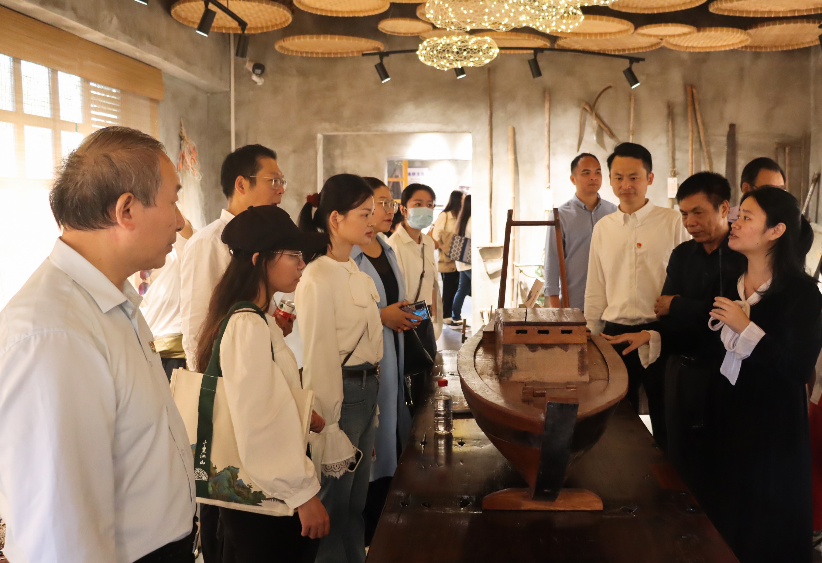 接着,大家来到渔耕文化馆,参观了各式各样的渔耕文化展品,包括渔船模型、捕鱼工具、传统渔网等老物件,深入了解了北海渔民的生活生产方式,同时讲解员也为大家详细讲解了电建村的发展变迁史,这使得大家深刻体会到了保护和传承渔耕文化的重要性。