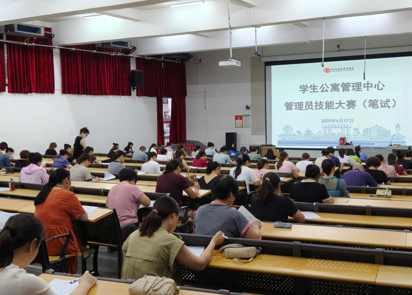 6月17日9:00-10:00,笔试环节在我校西校区功德楼107举行。考试以闭卷形式开展,内容紧扣《学生公寓管理员岗位职责(试行)》《北海艺术设计学院学生公寓管理规定(修订)》等制度文件,重点检验管理员对岗位规范与管理要求的掌握程度。笔试考纪严格,最终笔试成绩前12名管理员晋级技能测试环节。