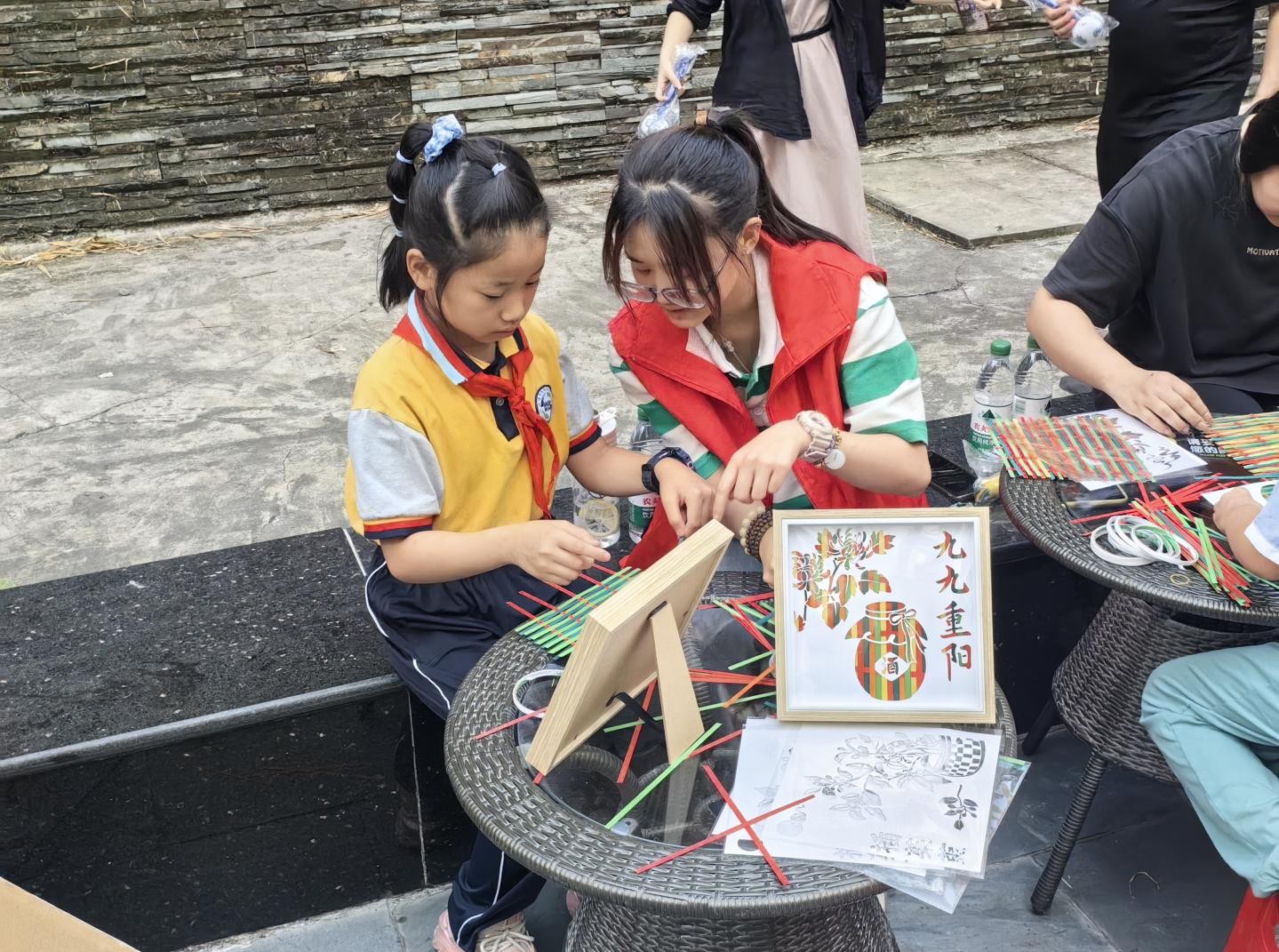 首先,志愿者们跟随老师前往社区老年人家中,送去慰问品和节日祝福,为老年人提供打扫卫生、整理房间等日常服务,与老人们亲切交谈,了解他们的生活状况和健康情况,为他们提供力所能及的帮助。在橄榄苑,志愿者们的热情宣传吸引了众多居民的参与。孩子们的欢声笑语让现场气氛更加热烈。他们在游戏中挑战猜谜语,赢取香囊,不仅享受了游戏的乐趣,也在动手制作竹编画的过程中,体验了传统文化的魅力,让重阳节的传统文化在孩子们心中生根发芽。