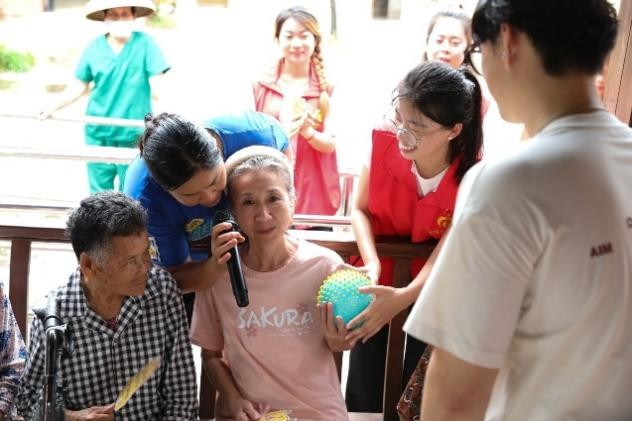 很快,今天的活动接近尾声。节目表演结束后,还开展了击花传鼓的游戏小活动,邀请爷爷奶奶们参与其中,并送上小礼物。随着欢快的鼓点声响起,那朵象征欢乐传递的花在老人们之间迅速流转。老人们的眼睛紧紧盯着花朵,脸上满是期待与兴奋。每当鼓声停止,拿到花的人需展示一段小才艺。现场的爷爷奶奶们非常积极地与我们的志愿者互动并进行才艺表演,老人们都相当厉害。现场欢声笑语不断,气氛热烈而温馨。志愿者们还热情地为爷爷奶奶们分发水果、牛奶、小零食等,老人们被志愿者们的热情和关怀所打动,脸上洋溢着幸福的笑容。