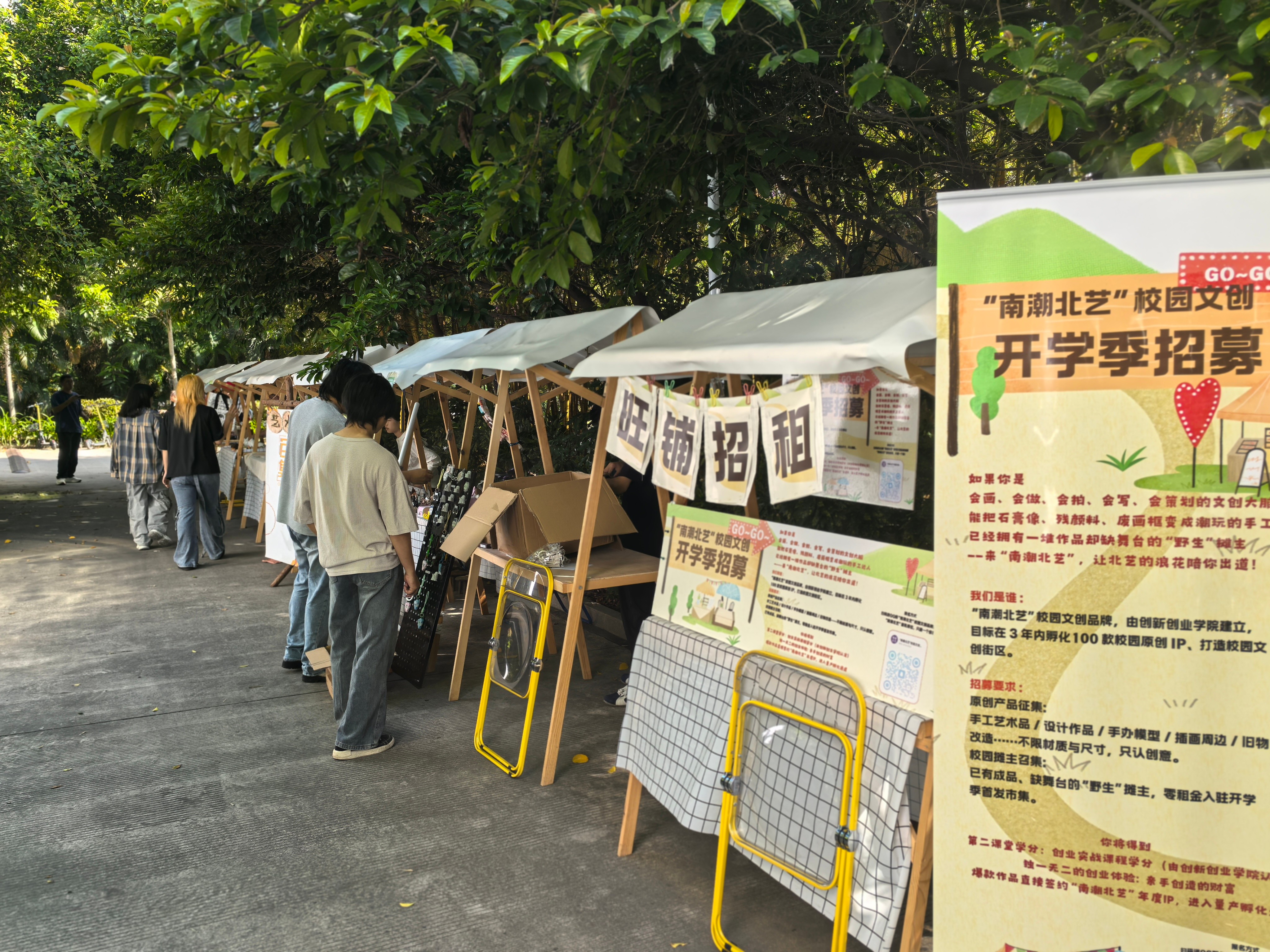 近日,由我校创新创业学院主办的“南潮北艺”文创展销会在校园里热闹启幕。本次展销会聚焦校园文创周边开发,吸引了全校众多师生文创团队参展,展销产品涵盖手作饰品、陶瓷制品、3D打印手办、非遗创新衍生品等数十款原创设计产品,单日接待师生超800人次。