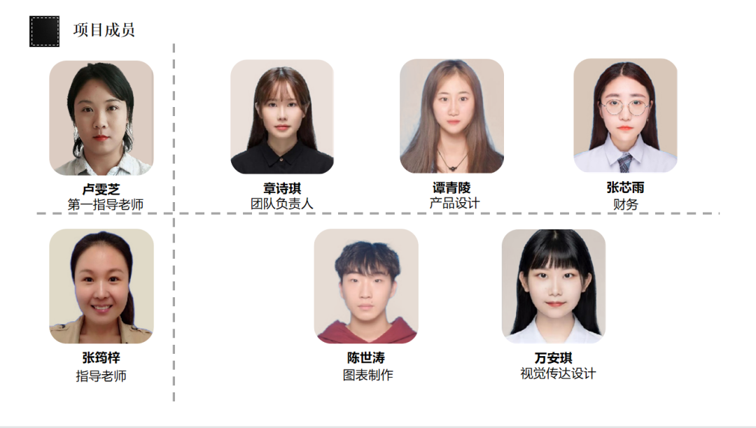 项目团队指导老师卢雯芝、张筠梓均是来自我校设计艺术学院的具有多年教学和指导经验的老师。团队还受到了小江瓷第五代非遗传承人叶尚风的指导。项目团队成员由4位来自设计艺术学院产品设计专业和1位视觉传达专业本生组成。