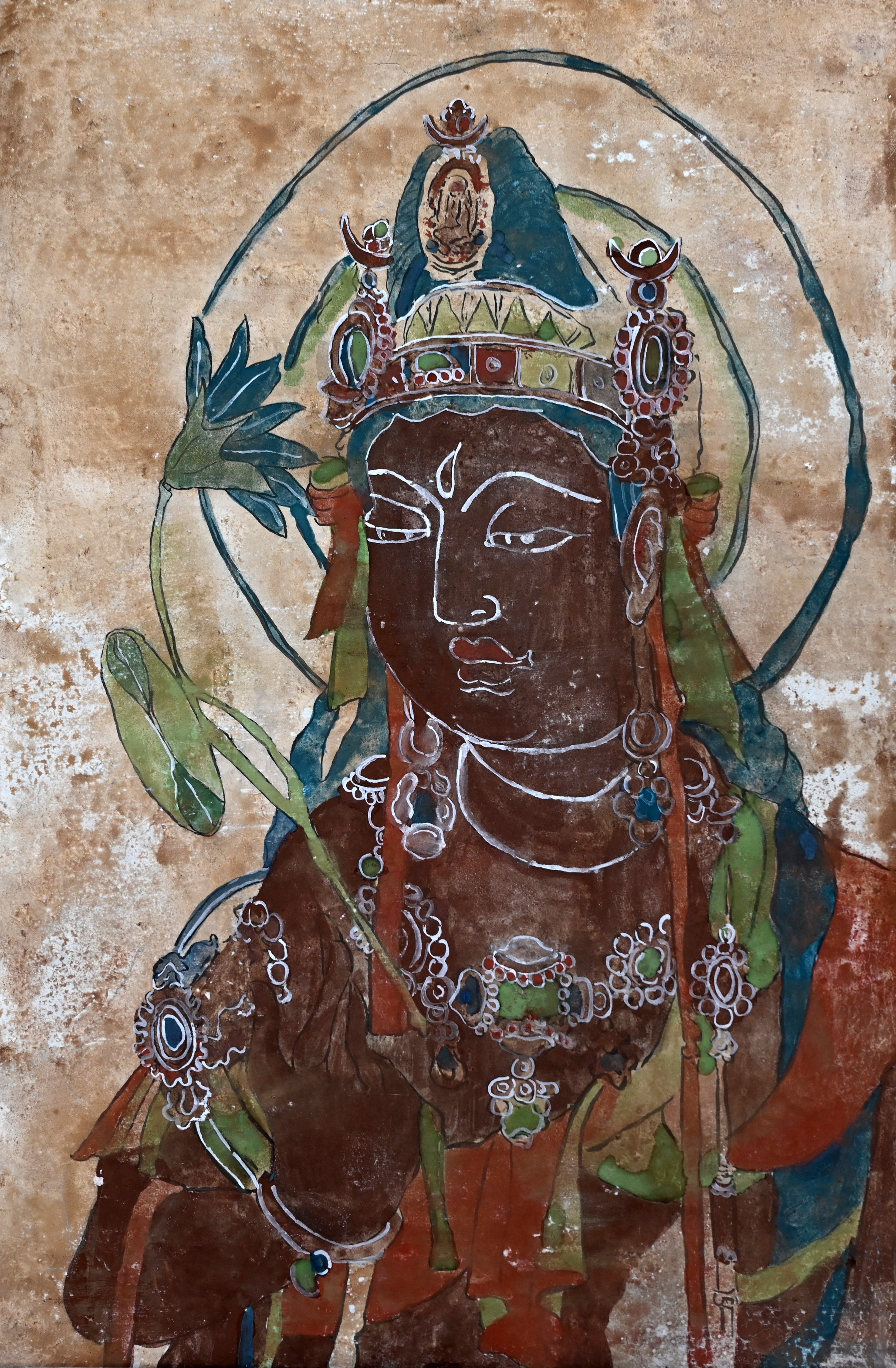 我的专业是水彩。水彩使用水溶性颜料,以水作为媒介,颜料的透明度较高;与中国画有所不同,中国传统壁画则是使用天然矿物色以及水干色颜料,相比水彩更加厚重。水彩的主要技法有:干画法、湿画法、干湿画法相结合,通过笔中水的多少来把握颜色的深浅;中国传统壁画则是先打底稿、再勾线、后画墨稿、最后上色。而敦煌莫高窟在经历了自然灾害后所呈现出的历史的破旧感,与水彩恰好有相似之处。通过这门课程的学习,我发现可以把中国传统壁画的表现方式运用到水彩之中,创新绘画方式,实现多种绘画方式的融合,给我日后的创作带来了全新的视角以及思路。