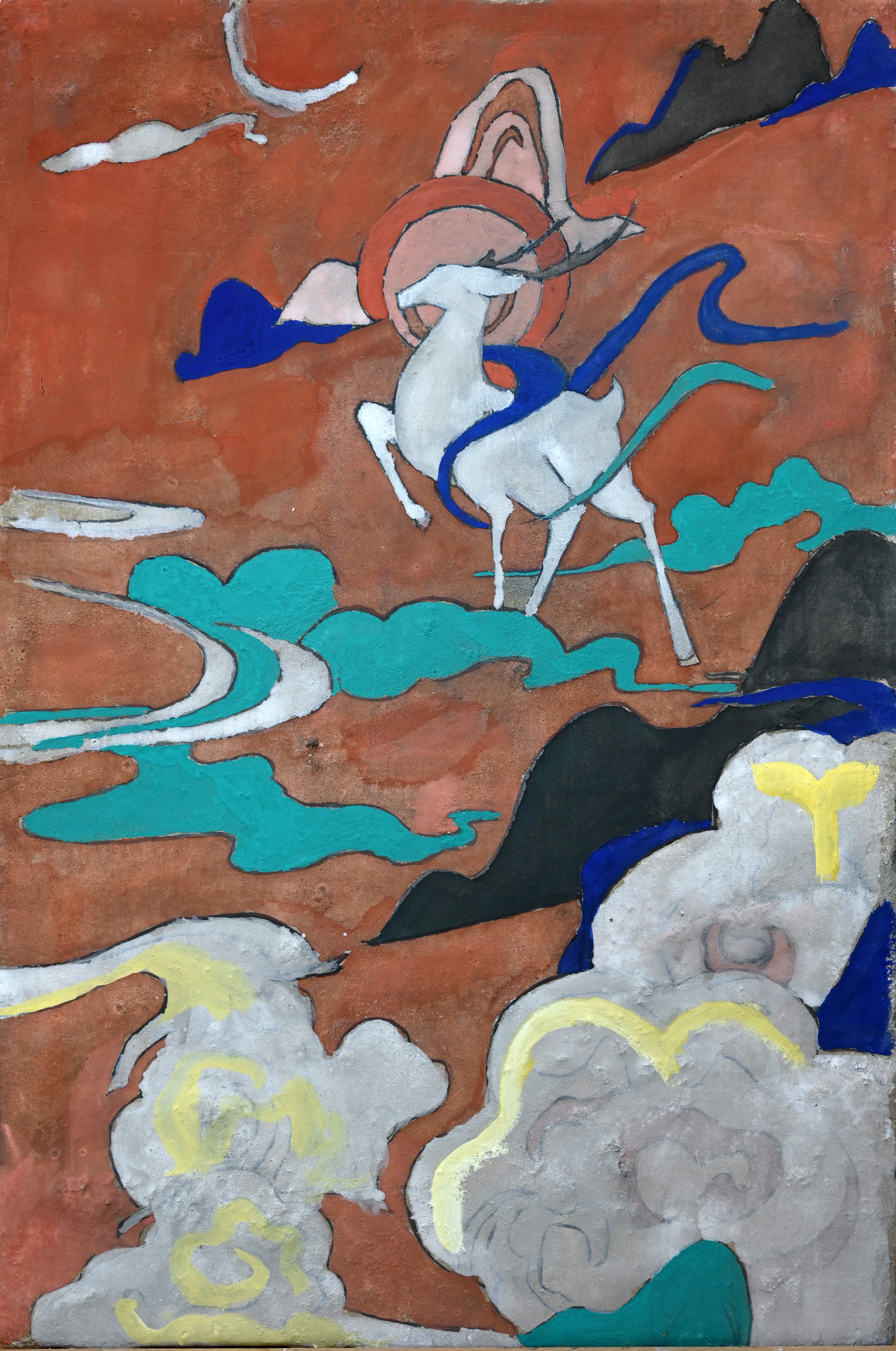 胡老师带着我们做地仗、模拟最真实的壁画体验,我们的作品也与原画同大,这都让我们更能深刻体会中国传统壁画绘画的语言表达。刚刚上手画的时候,我不太敢画,我们的画幅是最大的,但效果一直不强,导致我们小组出现明明应该是人多力量大却进度缓慢的问题。后来胡老师告诉我们254窟是北魏时期的,风格粗犷,可以大胆画一直鼓励我们引导我们大胆的表现,最后我明白完成比完美更重要。在初次上色时,我采用水彩技法里的平涂法铺色与壁画原作有着较大差距,胡老师后来告诉我们中国画要以线造型,用线找型,通过练习,我也逐渐感受到了中国画画法的独特魅力。
