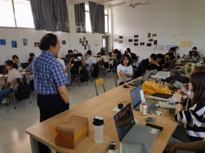 动画与传媒学院特聘教授/学术带头人李四达教授参观与指导学生学习,分享专业知识,学生们感到亲切,学生认真与教授交流学习,同学们都感到很振奋。(陈敬/摄)