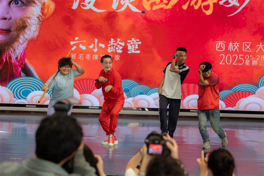 随后,六小龄童一句熟悉的“俺老孙来也!”开启了精彩讲座,他通过分享自身的创作故事与人生感悟,从《西游记》文学价值聊到戏剧表演艺术,为现场师生呈现了一堂别开生面的人生哲学课。