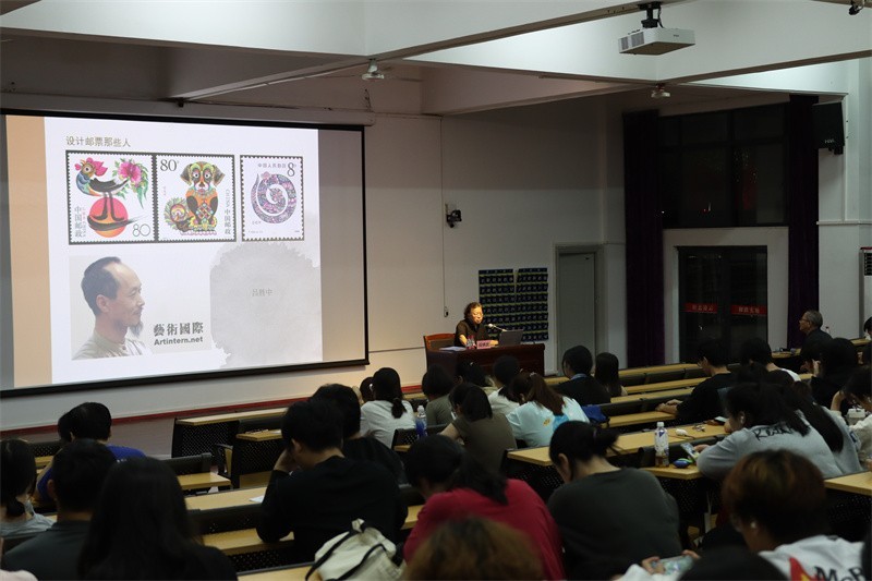 讲座伊始,阎炳武教授用专业性语言介绍邮票中传世的永恒智慧,展现了邮票与先贤思想、时间文化、吉祥文化、古今书画的融合。他表示,从事于邮票设计、雕刻工作,需博采众长、不断吸取历史各朝名家的画法,并运用各种技法来表现画作,才能为邮票注入传统文化非凡魅力。阎炳武教授还进一步引导广大师生对邮票技术发展的深思,促进运用古今中外留下的超前技术,来推动邮票行业不断向前发展。