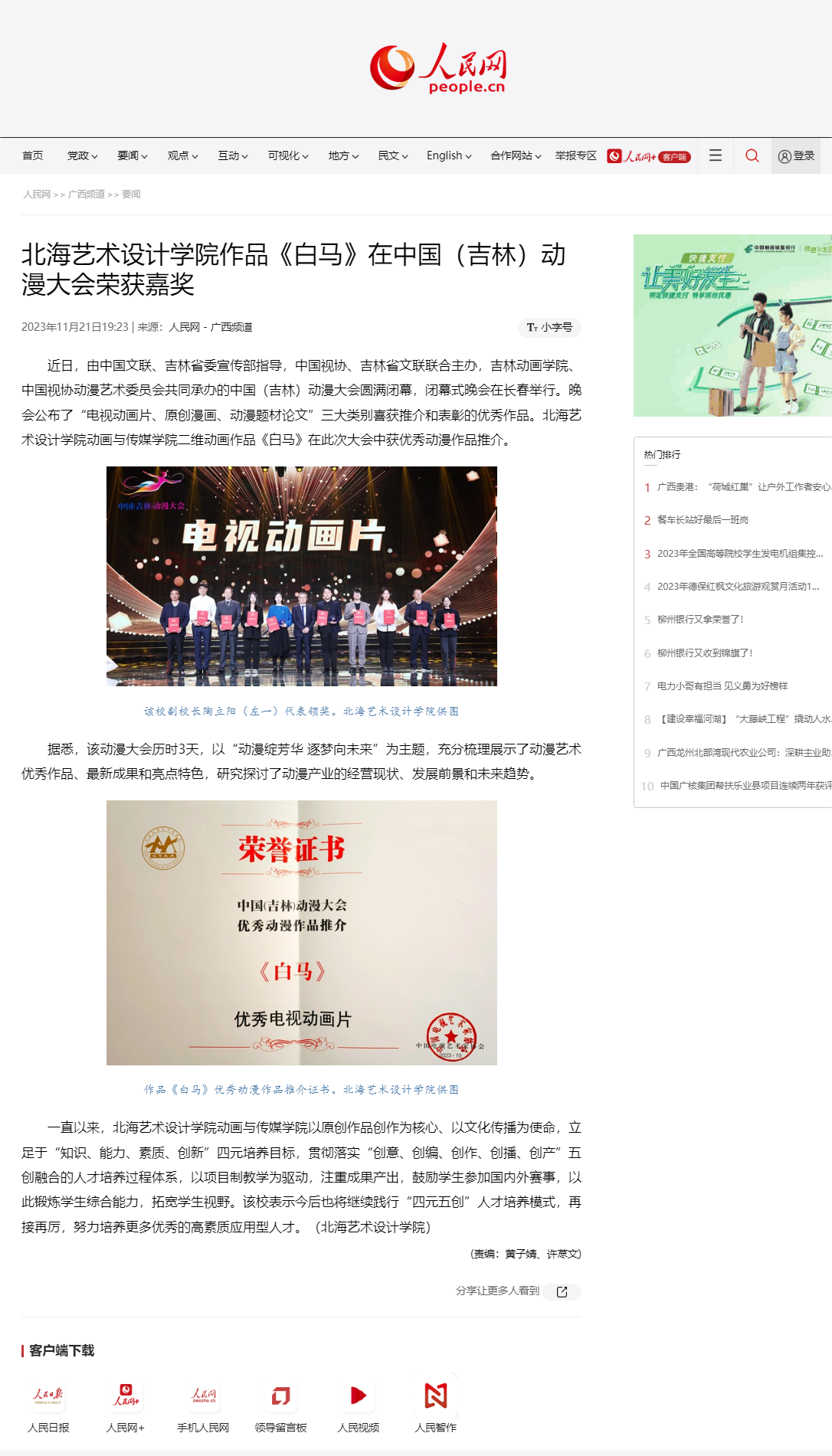 人民网:北海艺术设计学院作品《白马》在中国(吉林)动漫大会荣获嘉奖