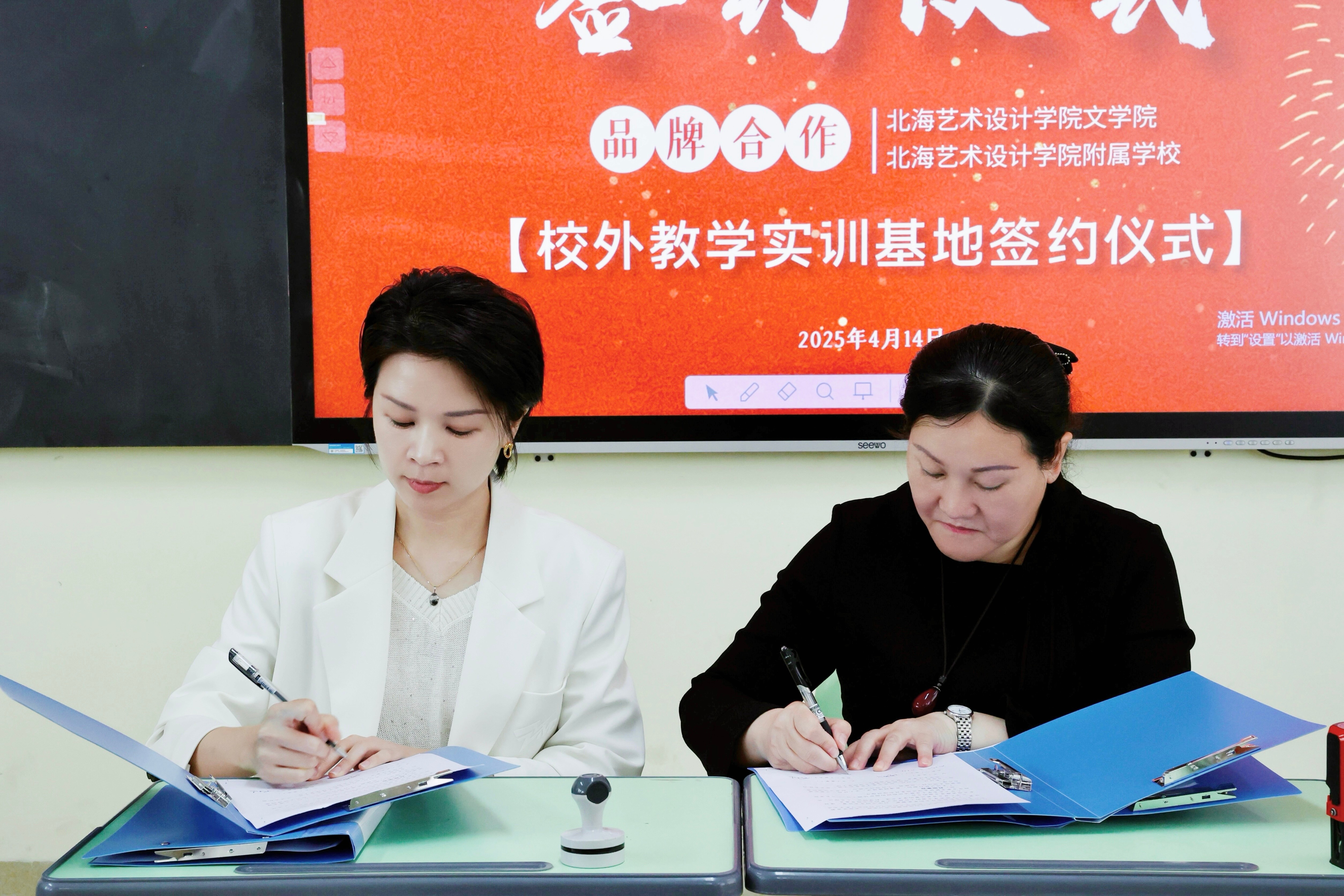 紧接着,双方共同签署了校外实训基地协议。根据协议内容,双方将在学生实习、师资培训等方面开展深入合作。文学院将定期选派优秀学生到北海艺术设计学院附属学校进行实习,并为小学教师提供专业培训和学术交流机会。北海艺术设计学院附属学校将为文学院学生提供实习岗位和实践教学平台,安排经验丰富的教师担任实习指导教师,共同开展教学研究和课程改革