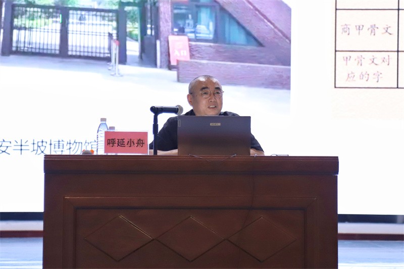 讲座伊始,呼延小舟先生以汉字演变脉络为逻辑主线,从半坡遗址刻画符号、甲骨文、金文的原始形态,到小篆的规范统一、隶书的蚕头燕尾,再到楷书的端庄规整与行草的灵动洒脱,系统梳理了中国文字数千年的发展谱系。他结合西安半坡博物馆等文化遗存实证,深入浅出地阐释了汉字作为中华文明“活化石”的载体价值,强调其不仅是交流工具,更凝聚着中华民族独有的文化基因与智慧结晶,见证了中华文明的薪火相传。