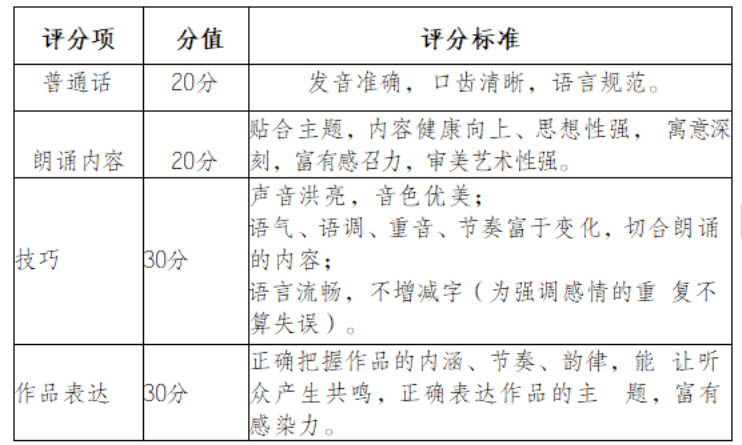 二、复赛:专家评审团按照《复赛评分标准》(见表1)对参赛作品进行打分,根据得分排名分别选出各组24个作品进入朗诵大赛决赛。