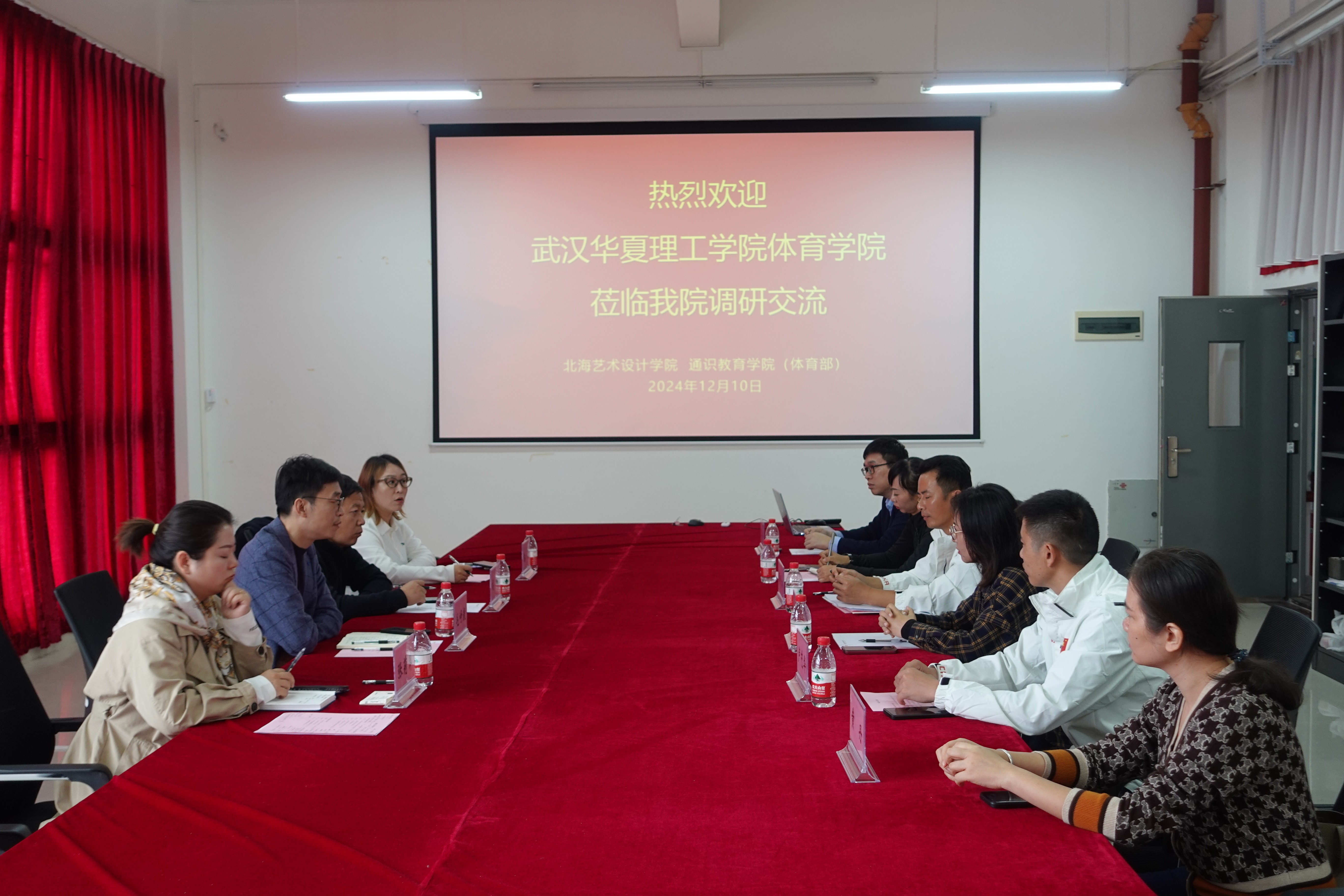 为加强校际交流合作,12月10日下午,武汉华夏理工学院体育学院行政副院长、党总支副书记毛峥毅一行4人莅临我院调研交流。学院院长兼体育部部长杨莹、副院长黄丹、体育部副部长廖民松、体育教研室副主任包永明出席座谈会并讲话。座谈会由学院院长兼体育部部长杨莹主持。