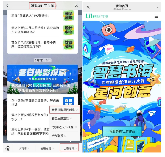 2、在“翼狐设计学习库”公众号,点击菜单栏,选择 “比赛活动”-“智慧书海星河创意”即可进入活动页面报名参加活动。