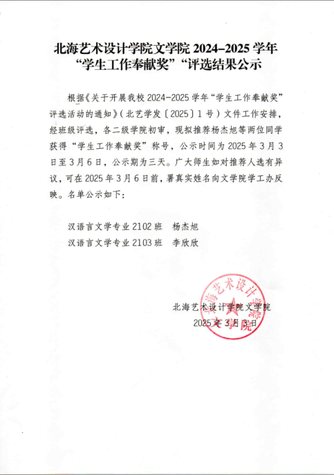 北海艺术设计学院文学院 2024-2025 学年“学生工作奉献奖”评选结果公示