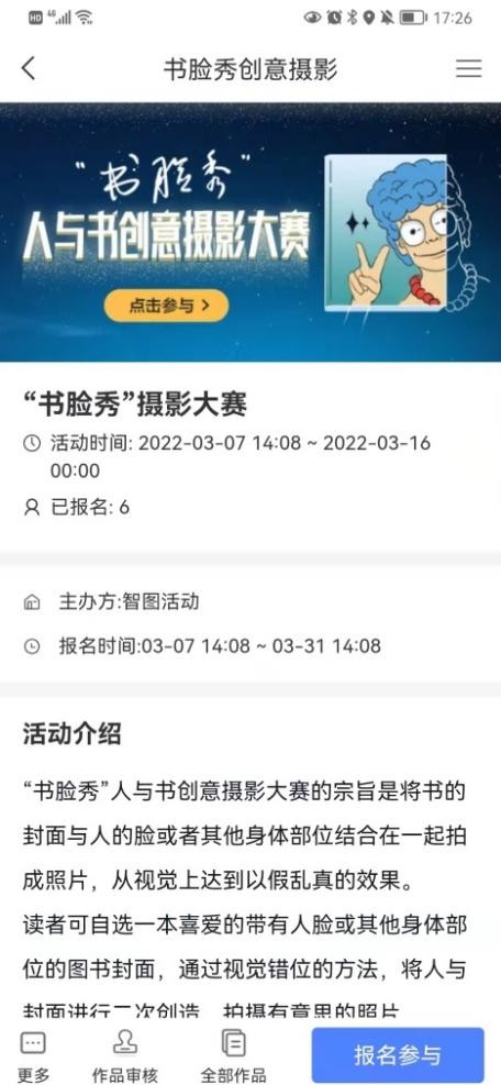 (2)通过活动报名界面,在“作品展示”栏目上传作品“书脸秀”创意摄影作品图片、合影图书/期刊资源名称、书籍内容或书评(100字以内)。