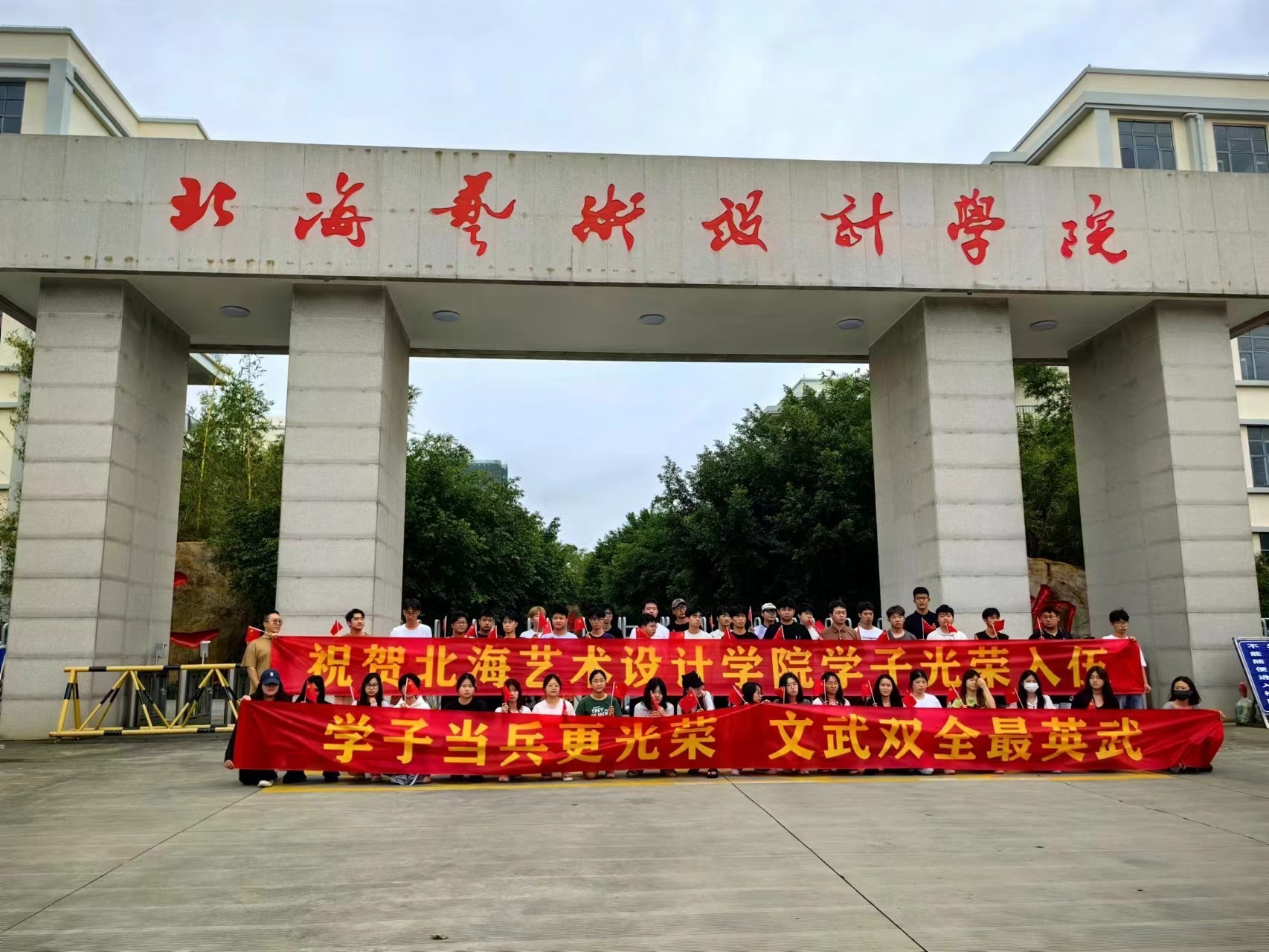 “学子当兵更光荣,文武双全最英武”。9月15日,北海艺术设计学院为光荣入伍的学生举行欢送仪式。美术学院有三名学生投身军营,光荣入伍。他们分别是绘画1901徐浩东、书法2201腾猛、书法2202田光磊。