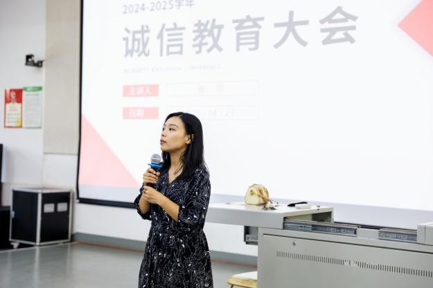 本次大会以真实案例敲响诚信警钟,希望同学们能常怀感恩之心,将诚信化作前行力量,用真才实学报效祖国。(战思伊/摄)