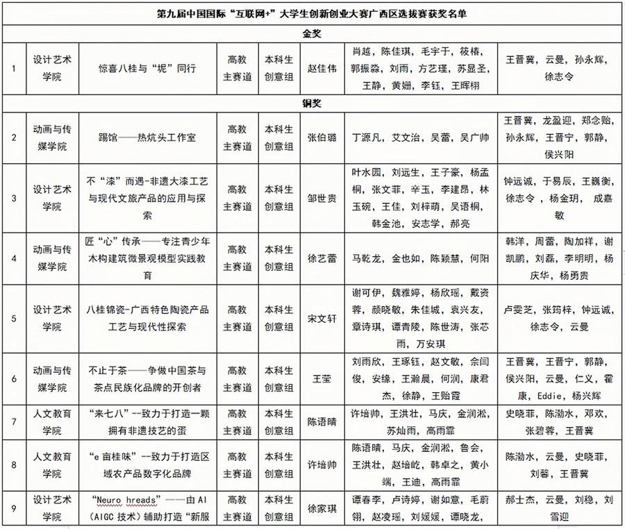 近日,广西壮族自治区教育厅发文公布了第九届中国国际“互联网+”大学生创新创业大赛“数广集团杯”广西赛区选拔赛获奖名单,我校斩获奖项共17项,其中,项目《惊喜八桂与“坭”同行》斩获自治区级金奖,其它晋级区赛的16个项目荣获自治区级铜奖。