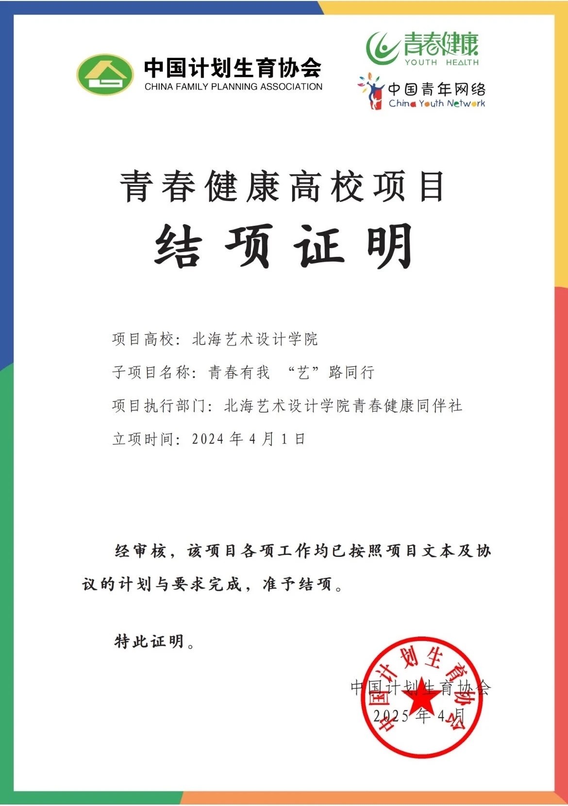 我校青春健康同伴社于2024年4月1日申请并中标了“中国计划生育协会2024年青春健康高校项目点”,并于2024年顺利完成项目计划,经过国家专家评审于2025年顺利结项。