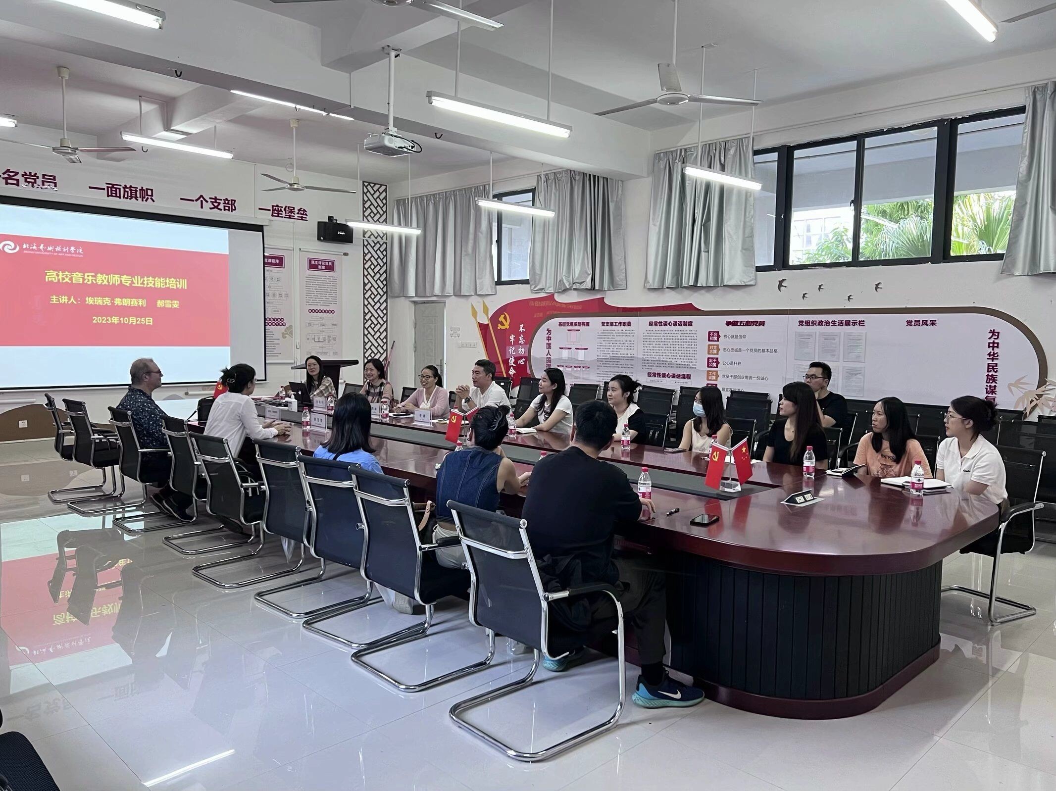 为加强师资队伍的建设,提升青年教师专业技能水平人文教育学院对青年教师开展专项培训10月25日下午,人文教育学院高校音乐教师专业技能培训启动仪式在西校区公德楼204会议室举行,人文教育学院客座教授旅法长笛演奏家郝雪雯女士、古典吉他演奏家埃瑞克·弗朗塞利(Eric Franceries)先生、人文教育学院院长熊秀峰、副院长李谦及全体音乐教师出席启动仪式。仪式由艺术教育教研室主任孙嘉昕主持。