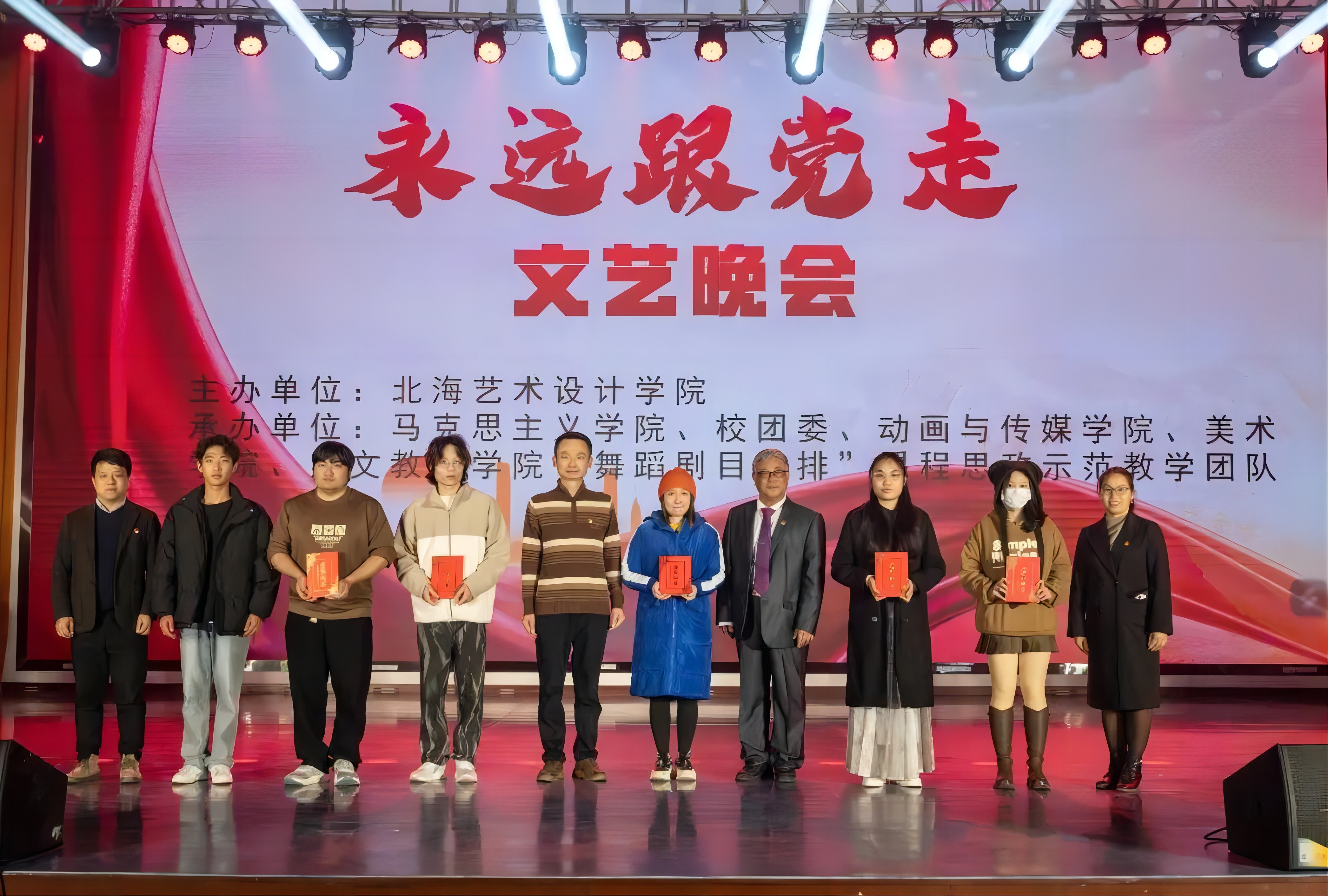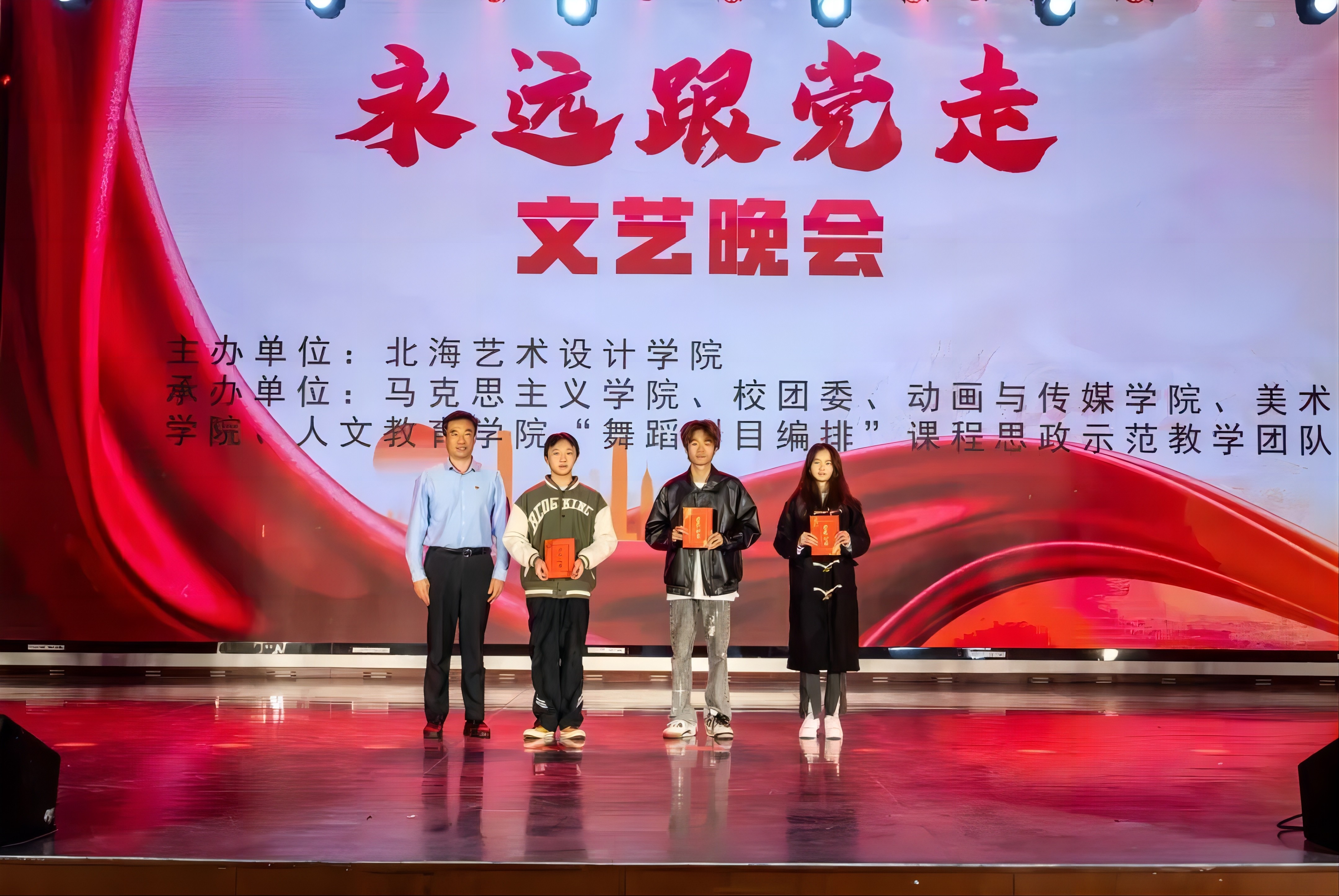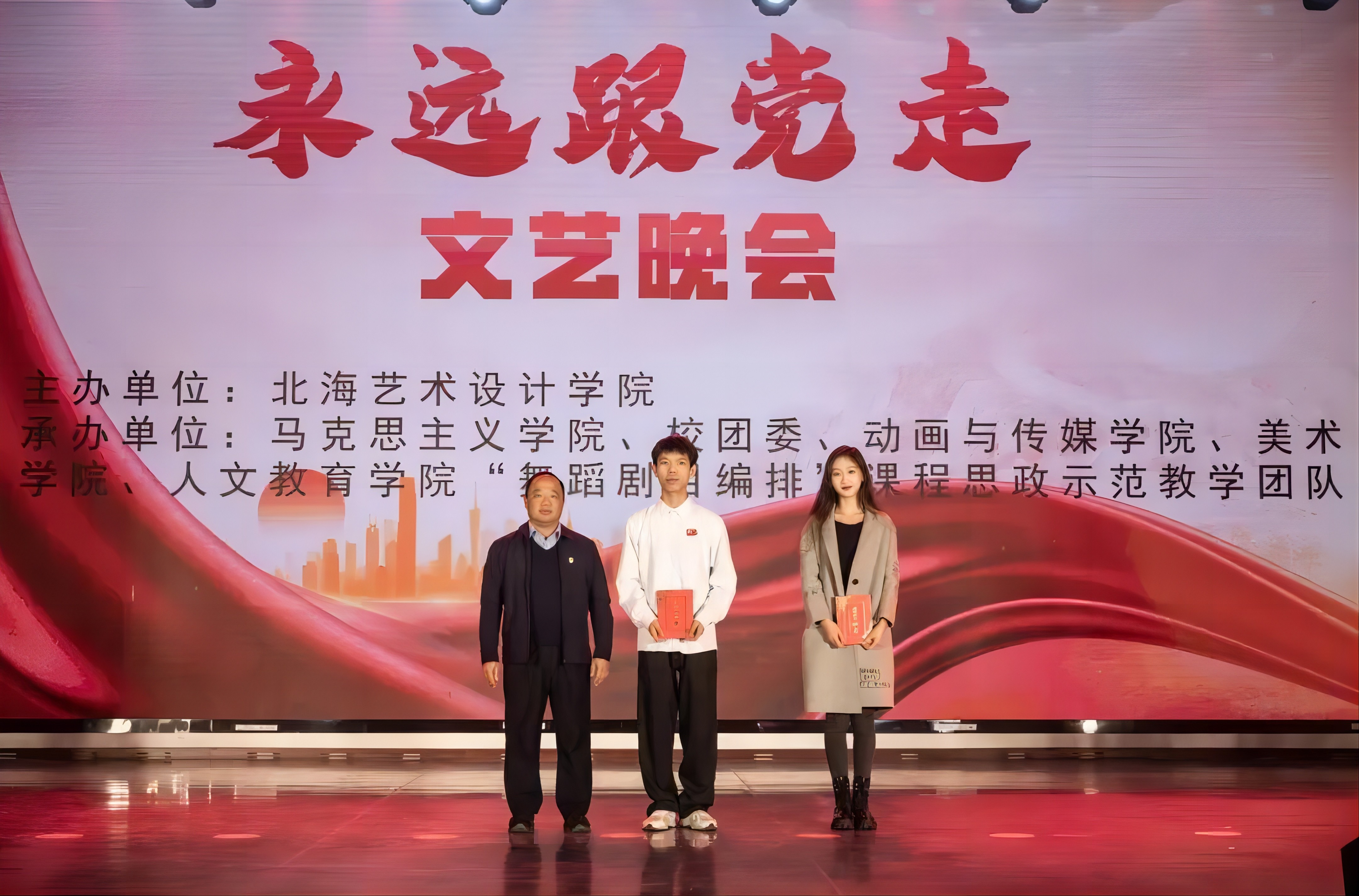 冬日的暖阳照耀北艺,和煦的暖风扬起旗帜。12月26日晚,我校在西校区大礼堂举办“永远跟党走”文艺晚会。晚会由北海艺术设计学院主办,马克思主义学院、校团委、动画与传媒学院、美术学院、人文教育学院、“舞蹈剧目编排”课程思政示范教学团队联合承办。学校党委书记范徽忠,副校长陶立阳出席晚会,校团委书记唐良春,人文教育学院党总支书记、院长熊秀峰,马克思主义学院院长姜献生及各二级学院老师参加晚会。