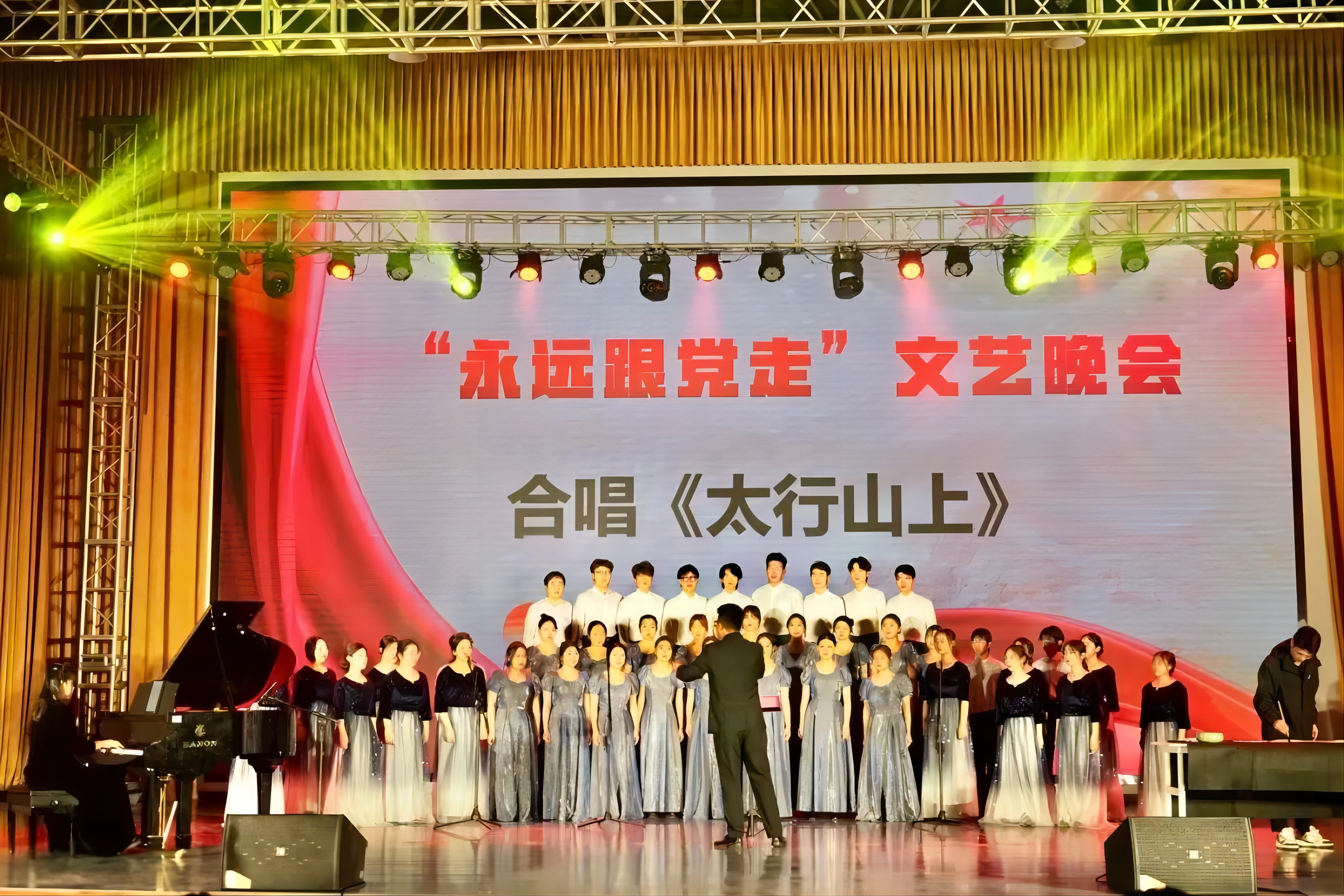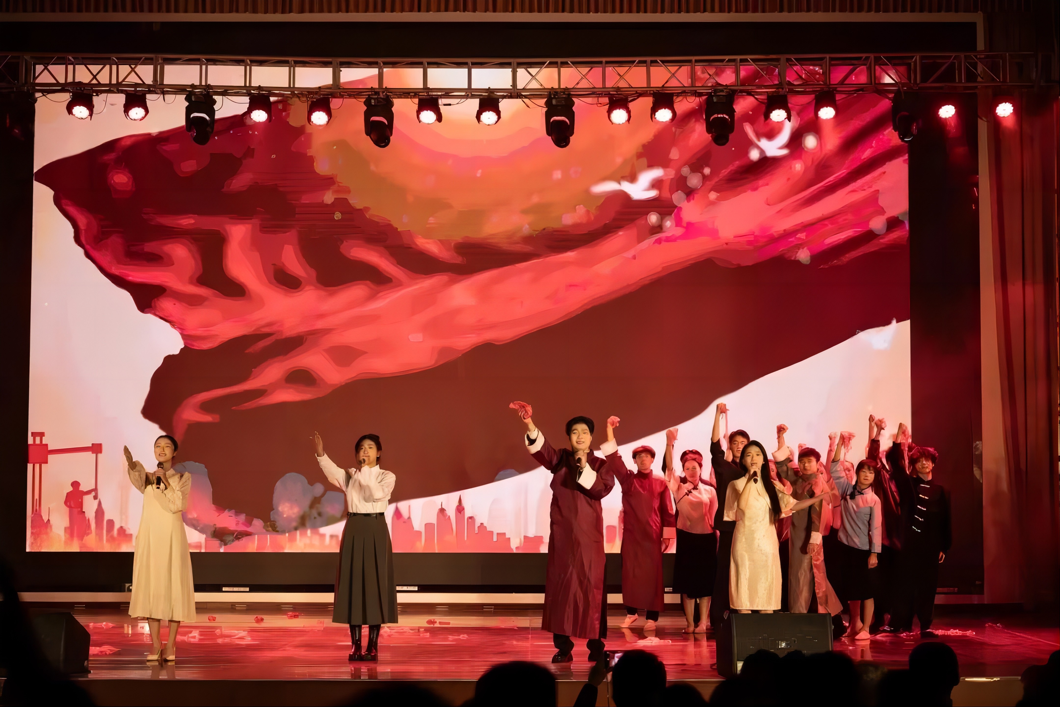 随后,由校合唱团带来的合唱《太行山上》余音绕梁,结合现场书法气势恢宏,台下观众情绪随着旋律此起彼伏;舞台剧《红绸》用艺术的方式讲述了中国共产党诞生的故事,现场热血激昂;舞蹈《风筝》《雨花石的等待》《离开雷锋的日子》《永不消逝的花》用不同的舞蹈风格,展现了永远跟党走的决心和对革命历史故事感悟;群体诗朗诵《沁园春·长沙/沁园春·雪》《为有牺牲多壮志》铿锵有力,用声音传递伟大革命思想;朗诵《毛主席的光辉照万代》体现了民族大团结,同心同向在学习伟人的光辉历程中不断前进。