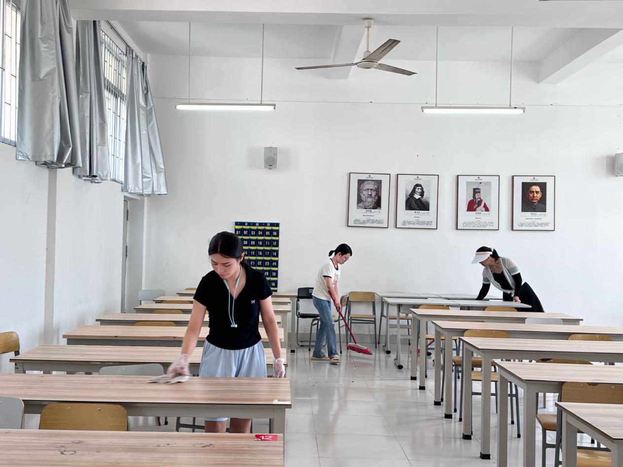 8月30日下午,在蒋辉平副院长的带领下,哲学学院全体教职工深入觉悟楼,手持清洁工具,分工合作,打扫教室、擦拭桌椅、清洁地面、收拾垃圾,细致入微地清扫教学楼每个角落的灰尘,做到教室干净卫生,桌椅摆放井然有序。同时,教师们对教室的门窗、桌椅、灯具进行检查,并将发现的问题进行了记录和处理,确保教室设施正常运转。