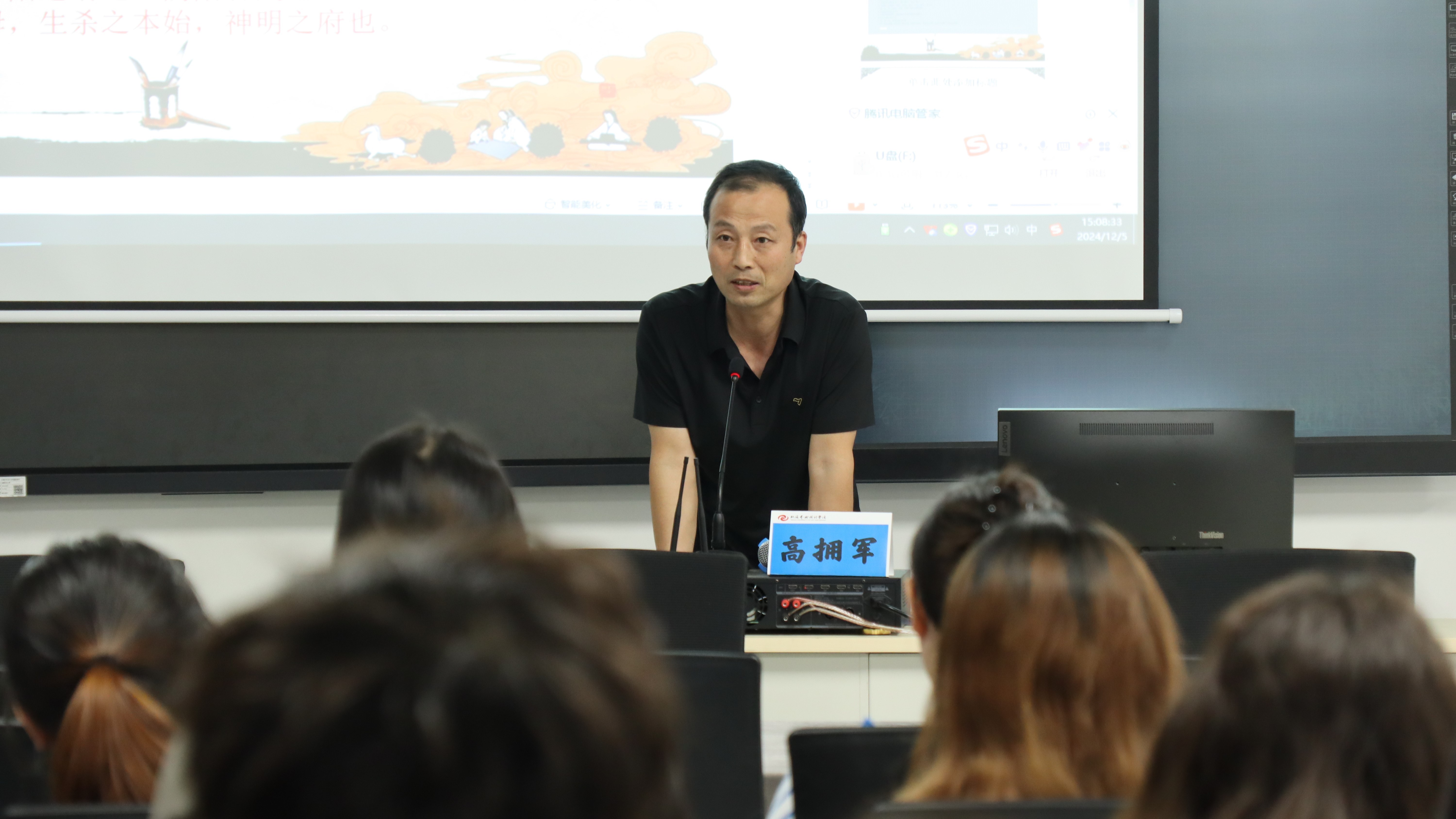 高拥军先生以其深厚的书法造诣丰富的学术经验,围绕书法的文化品格这一主题,展开深入而精彩的讲解。他从书法的历史渊源讲起,逐一剖析书法在不同历史时期的文化内涵和艺术特色,并强调书法作为中国传统文化瑰宝的独特地位和价值。座谈会上,高拥军先生还与参会师生进行积极互动,耐心解答大家关于书法学习、创作及文化理解等方面的问题。他的讲解深入浅出,既具有学术性,又贴近实际,赢得了在场师生的阵阵掌声。