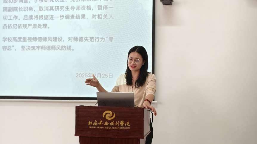 紧接着岳书记带领大家学习《北海艺术设计学院教师师德失范行为处理办法》,旨在深化师德师风建设,通过明确规章制度来引导和规范教师的职业行为,同时建立健全师德失范行为的受理、调查和处理机制,确保对师德失范行为能够及时、公正、有效地进行处理,从而全面落实立德树人这一根本任务,为培养更多优秀人才贡献力量。