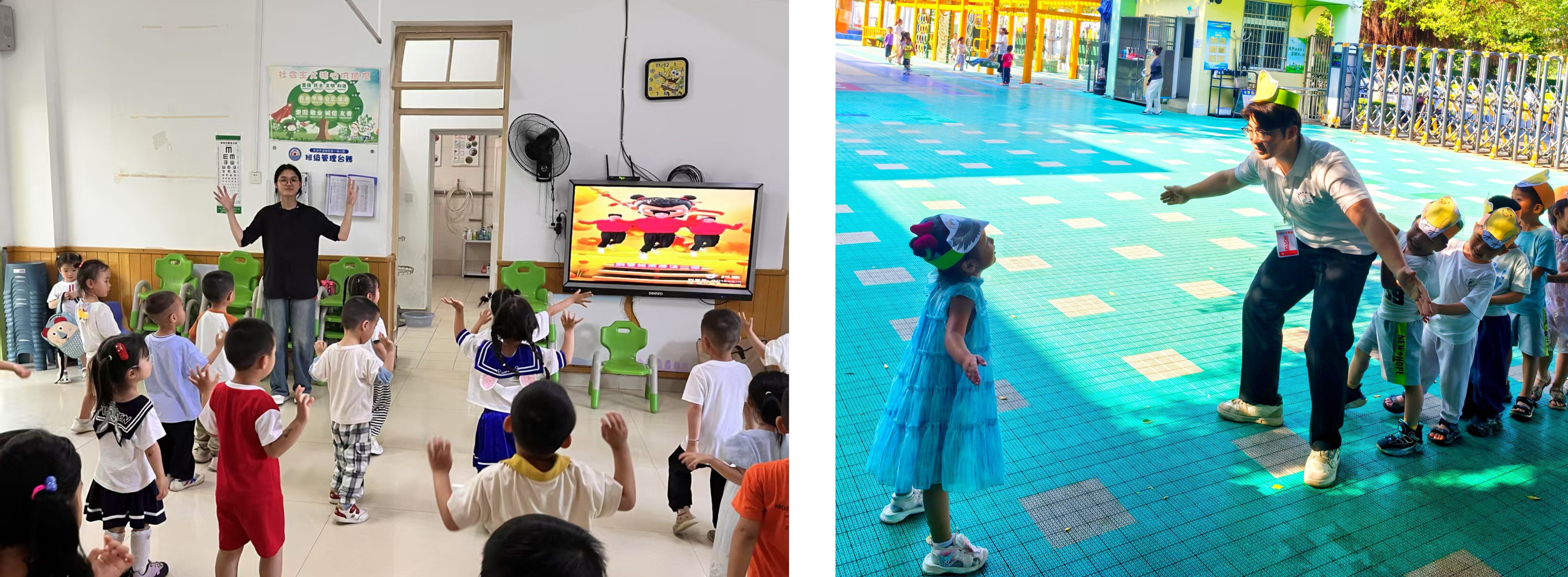 学前2402班李智燕带领幼儿做律动               学前2401班丁朝旭与幼儿游戏