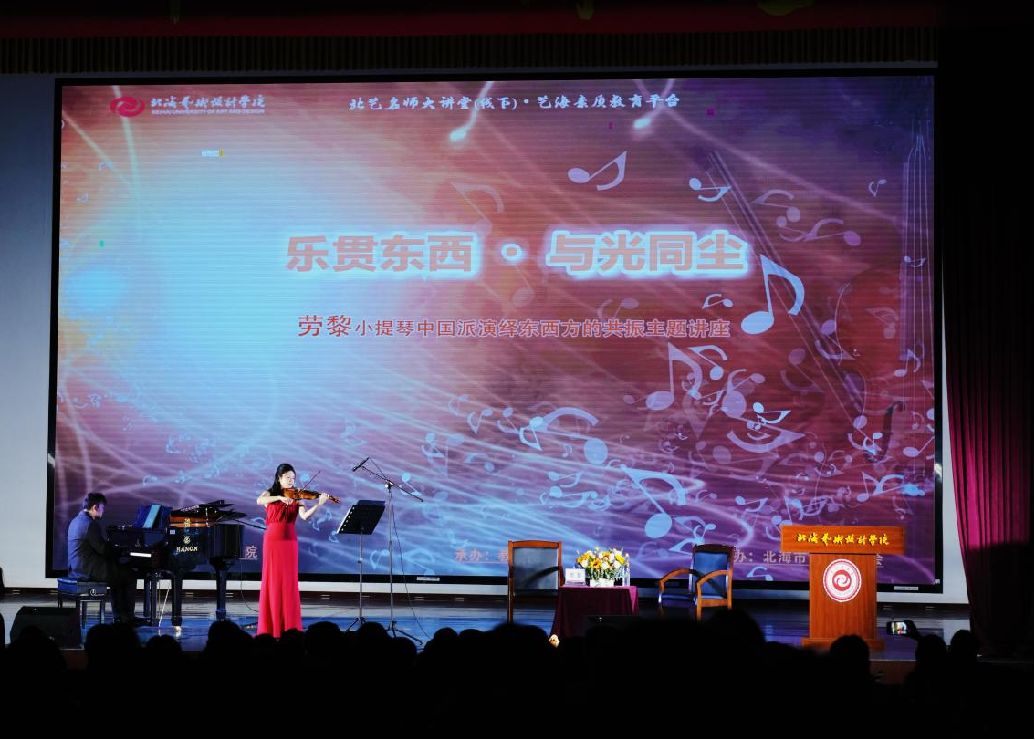 2025年5月9日晚,北海艺术设计学院为深化美育教育实践、提升学生的艺术修养,特邀请到国际乐坛备受瞩目的中国小提琴演奏家、中央音乐学院管弦系劳黎老师,以“乐贯东西・与光同尘”为主题,用灵动的琴弦编织出跨越国界的艺术对话。北海艺术设计学院校长卢新华、副校长包建明、总督学王斌、纪委书记王照伟、教育学院院长熊秀峰、副院长蒙剑英等领导出席了本次活动。同时,本次活动受到了北海市文艺界与教育界的广泛关注,北海市音乐家协会主席林海等众多社会各界的音乐爱好人士莅临活动现场。