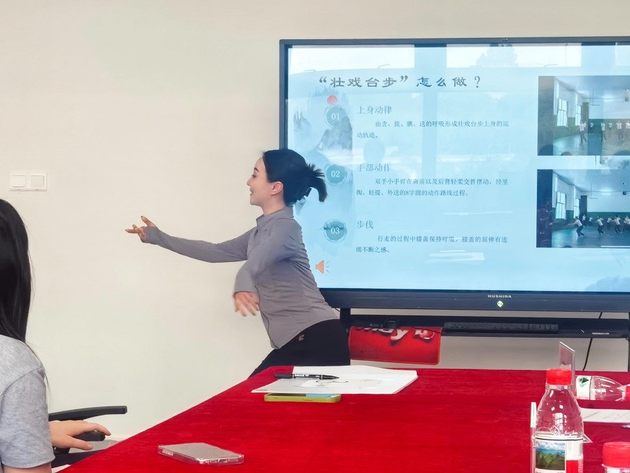 号选手盘乙瑶老师生动展现了壮族戏曲的独特魅力,其表演既遵循传统,又融入个人理解,呈现出鲜明的艺术层次与文化内涵。 盘乙瑶老师深入解析了壮戏台步的动律特点,强调"以韵带形,以情促动"的核心要领。通过专业示范及细致的讲解,从上身呼吸、手的运动轨迹、膝盖的起伏进行剖析,强调动作的规范性,充分体现了壮戏表演的韵律美。