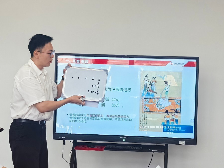六号选手刘琛钊老师上了一堂十分精彩的音乐基础课,从思政角度出发,讲解了中国传统音乐的七声调式。刘老师从人文历史出发,声情并茂地介绍了雅乐清乐燕乐三种不同中国传统音乐调式的风格特征及调式音阶特性。生动诠释艺术专业课程的思政育人路径。