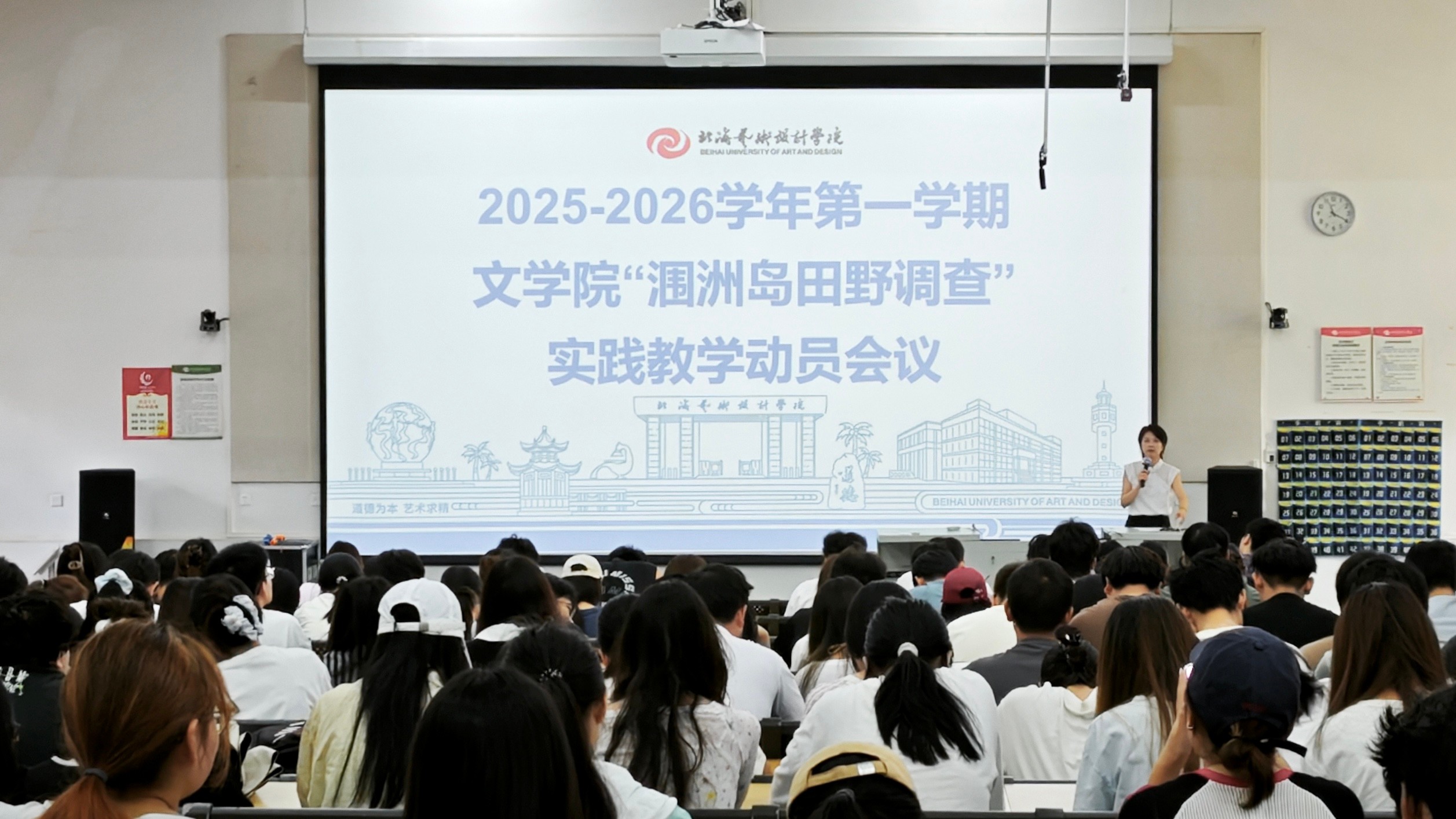 最后,常务副院长梁镨文老师做动员总结发言,她在讲话中指出,此次涠洲岛实践教学活动是文学院为学生量身打造的“移动课堂”,旨在让学生将课本知识转化为实践认知,让专业学习真正“活”起来。她强调,学生既要在深度学习中挖掘素材,创作出有质量的文字与摄影作品;也要在感受海岛魅力时,守住边界、文明出行,不破坏生态、不打扰居民生活。梁副院长再次强调“安全”是一切收获的前提,要求学生必须遵守集体纪律、保障人身财产安全、关注天气变化和健康状况。她表示,此次实践既是专业技能练兵,也是精神视野拓展,希望学生以文学视角感知海岛,以踏实言行展现文学素养,带着丰硕的成果平安归来。