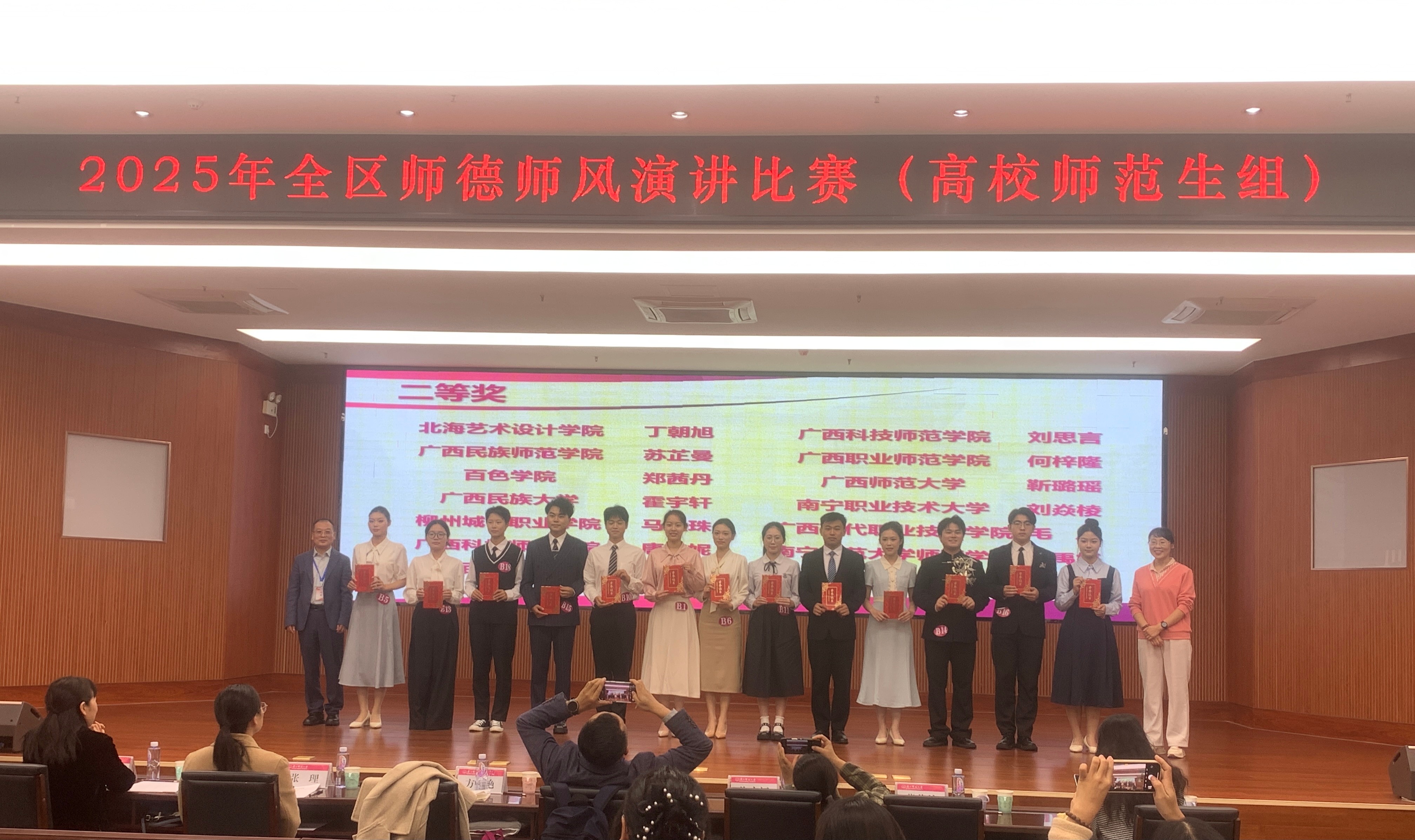 2025年11月8日至9日,由广西壮族自治区教育厅主办的以“铸魂强师,共绘教育蓝图”为主题的2025年全区师德师风演讲比赛在广西师范大学育才校区成功举行。教育学院学前教育专业两名学生参赛,经过激烈角逐,丁朝旭同学凭借出色表现荣获高校师范生组二等奖(排名第一),充分展现了我校学子扎实的专业素养与卓越风采。