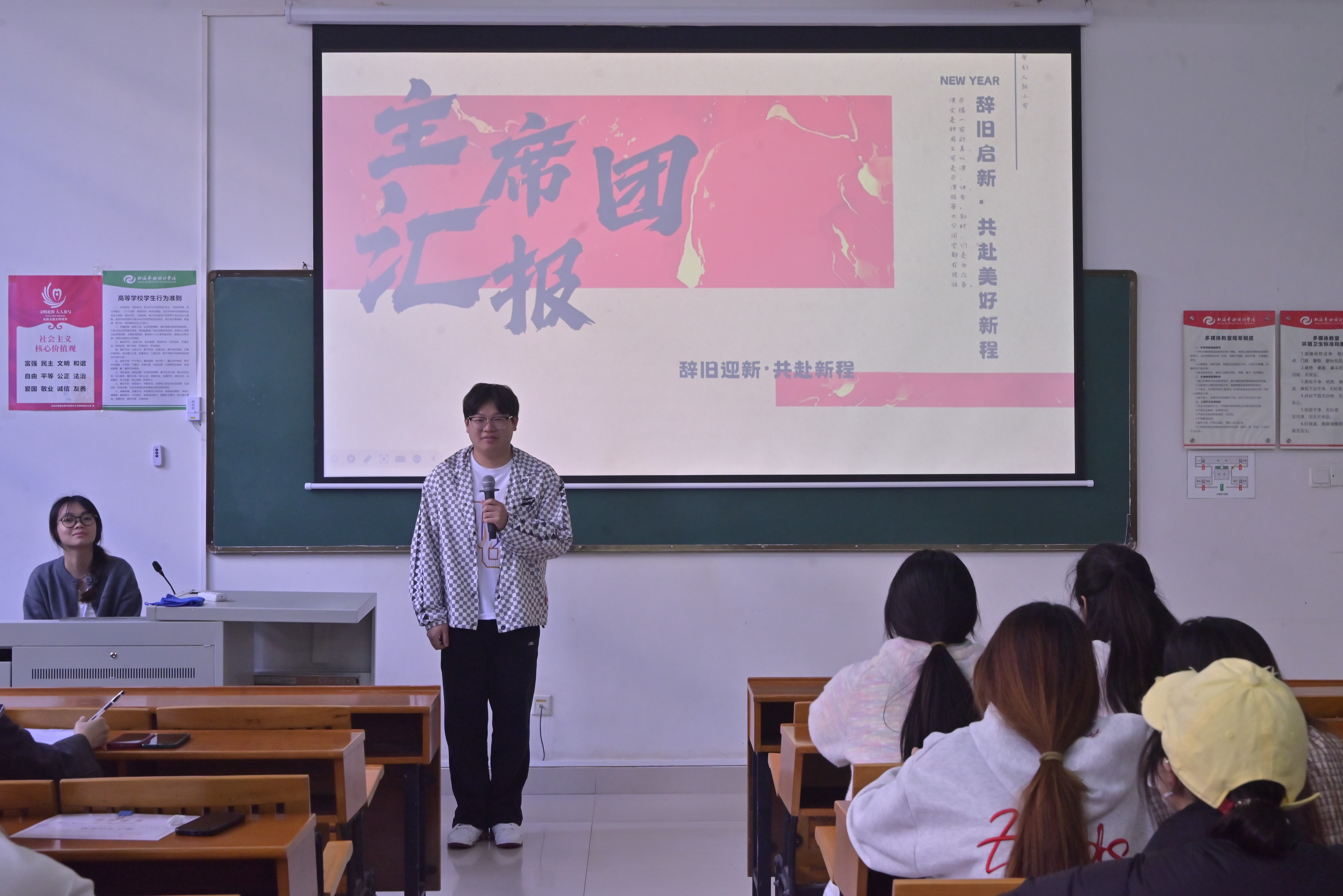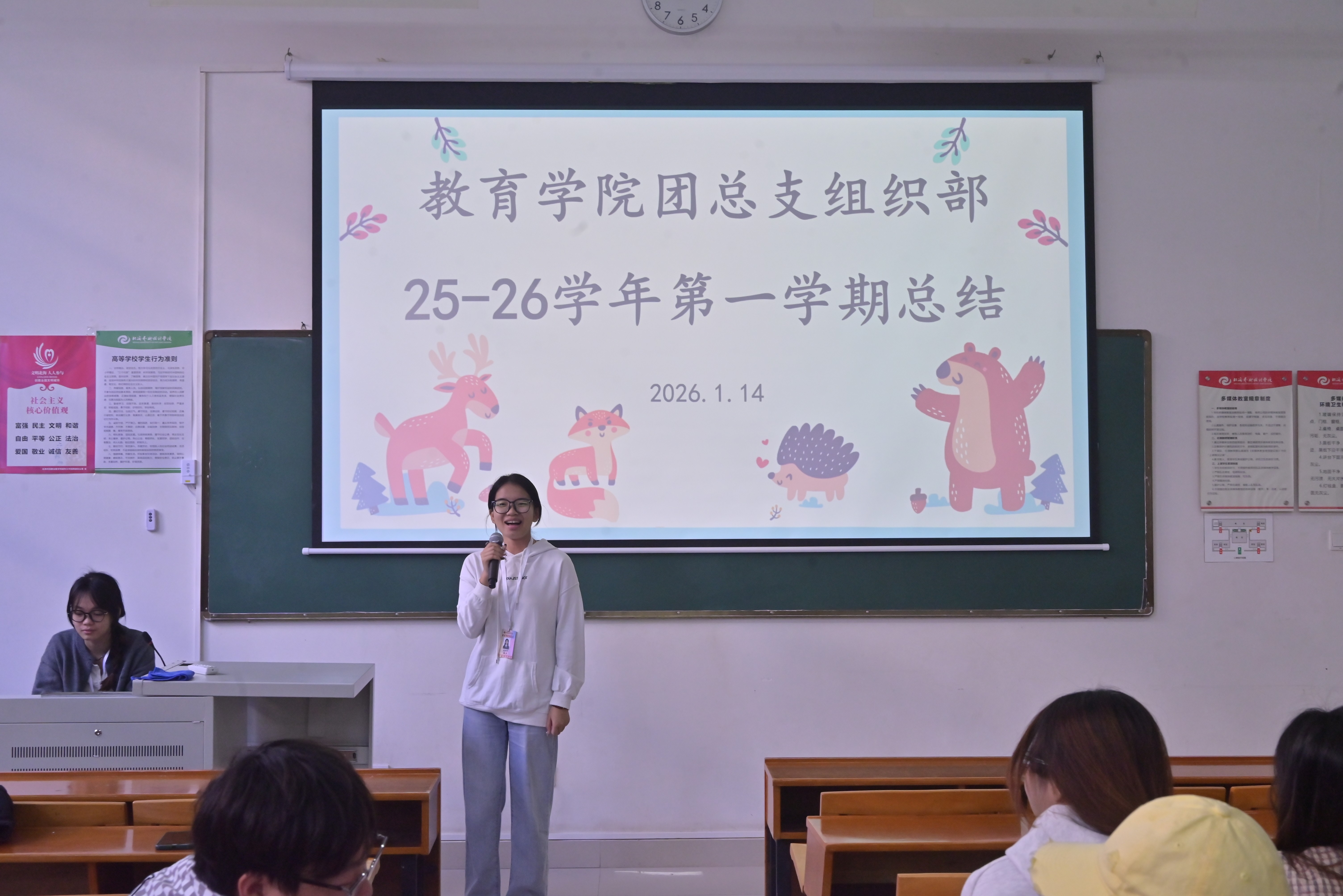 为全面总结本学期团总支各部门工作情况,表彰表现突出的优秀个人,激励全体学生干部在新学期再创佳绩2026114日,教育学院团总支工作总结暨表彰大会在公德楼102教室顺利举行。团总支书记陈美霖与全体学生干部参会。会议由文体部礼仪办主任刘燕菲主持