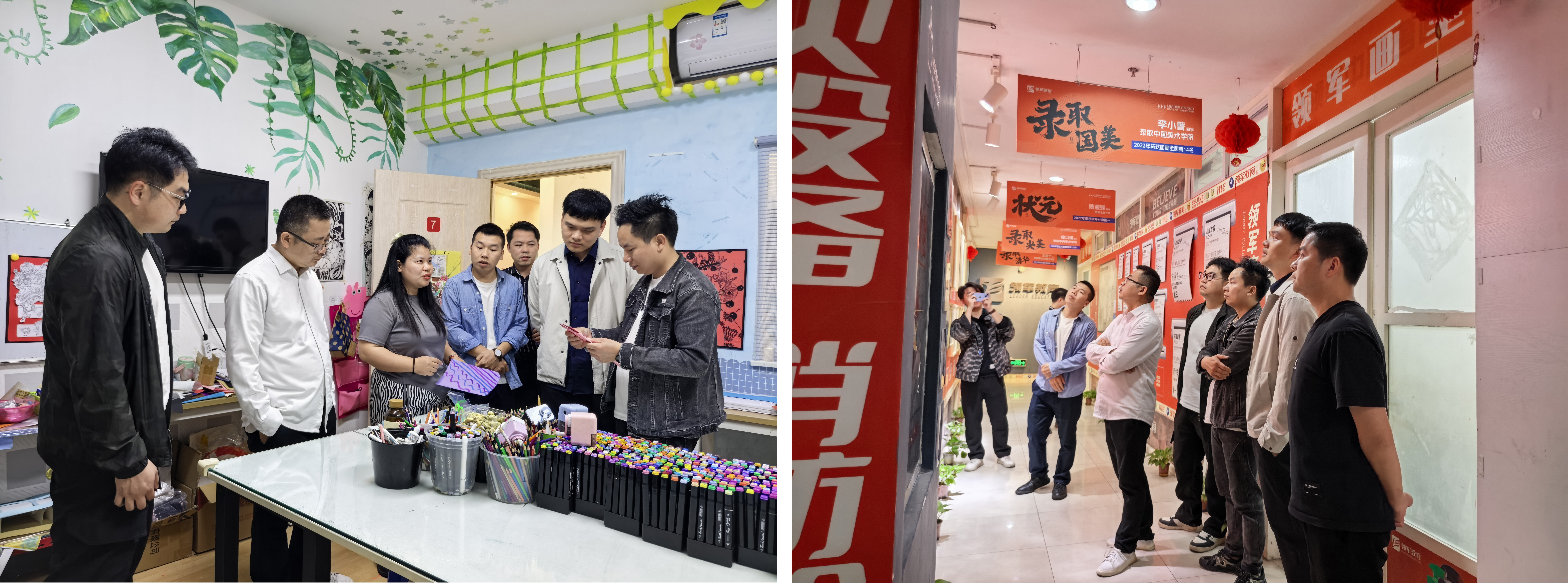 下午1630分,美术学院领导及老师们来到领军画室。此次到访,重点围绕美术学院学生在领军画室的就业情况展开交流。双方就解决学生实习问题进行了深入探讨,明确实习时间安排,以保障实习活动有序开展。同时,美术学院一行人详细了解了领军画室的上课形式和时间安排,以及画室学生数量和考试情况,为学院教学改革和人才培养方案的优化提供了有力依据。