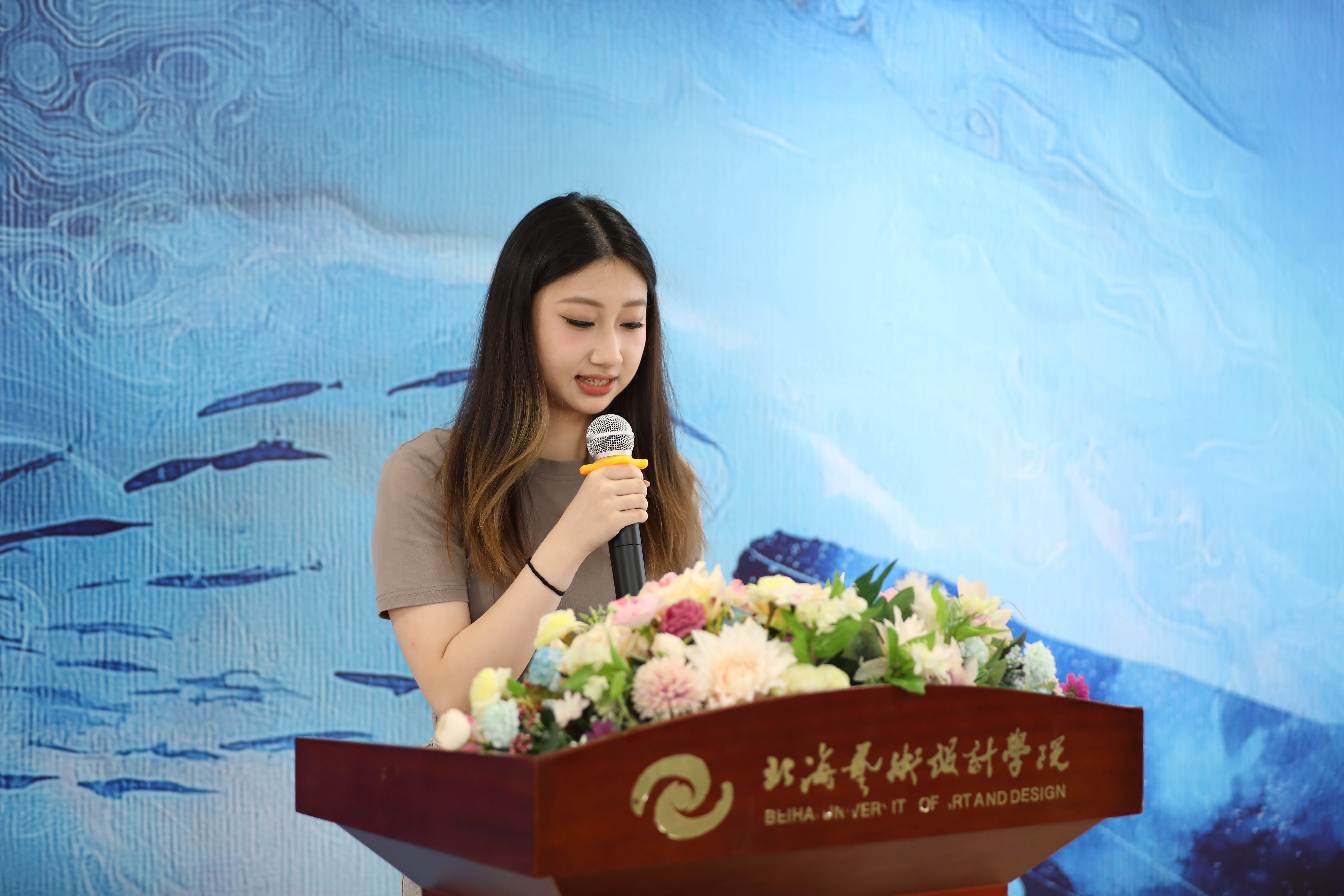 参展学生代表冯江依同学分享了她此次联展参与创作的心路历程。她坦言,创作过程中深刻体会到艺术不仅是技法的雕琢,更是情感与思想的载体,每一幅画面、每一帧动态,都是对世界满怀热切的提问与回应。冯江依同学表示非常感谢学院提供的展示平台,展望未来,同学们将继续深耕专业,以更成熟的作品传递正能量,践行艺术工作者的使命担当。