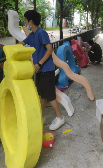 我院参加此次公共艺术周的作品名为《北部湾仲夏夜》,由雕塑教研室教师张泰莹、黄寿宁、欧安佳、杨凯、林盼鑫、金凯婧、许珍珍、覃媛媛等教师设计以及制作,共历时半个月。作品为泡沫切割成形为主,以墙漆调色上色为辅。以广西北部湾仲夏渔闲之余人们多彩的生活为背景,以不同形状及大小的海鱼为创作符号依据,对其进行提炼与简化,加以重新空间的布局与创作,作品尺寸:4mx0.8mx2m。作品表现“人”与“海”的和谐共生的主旋律。