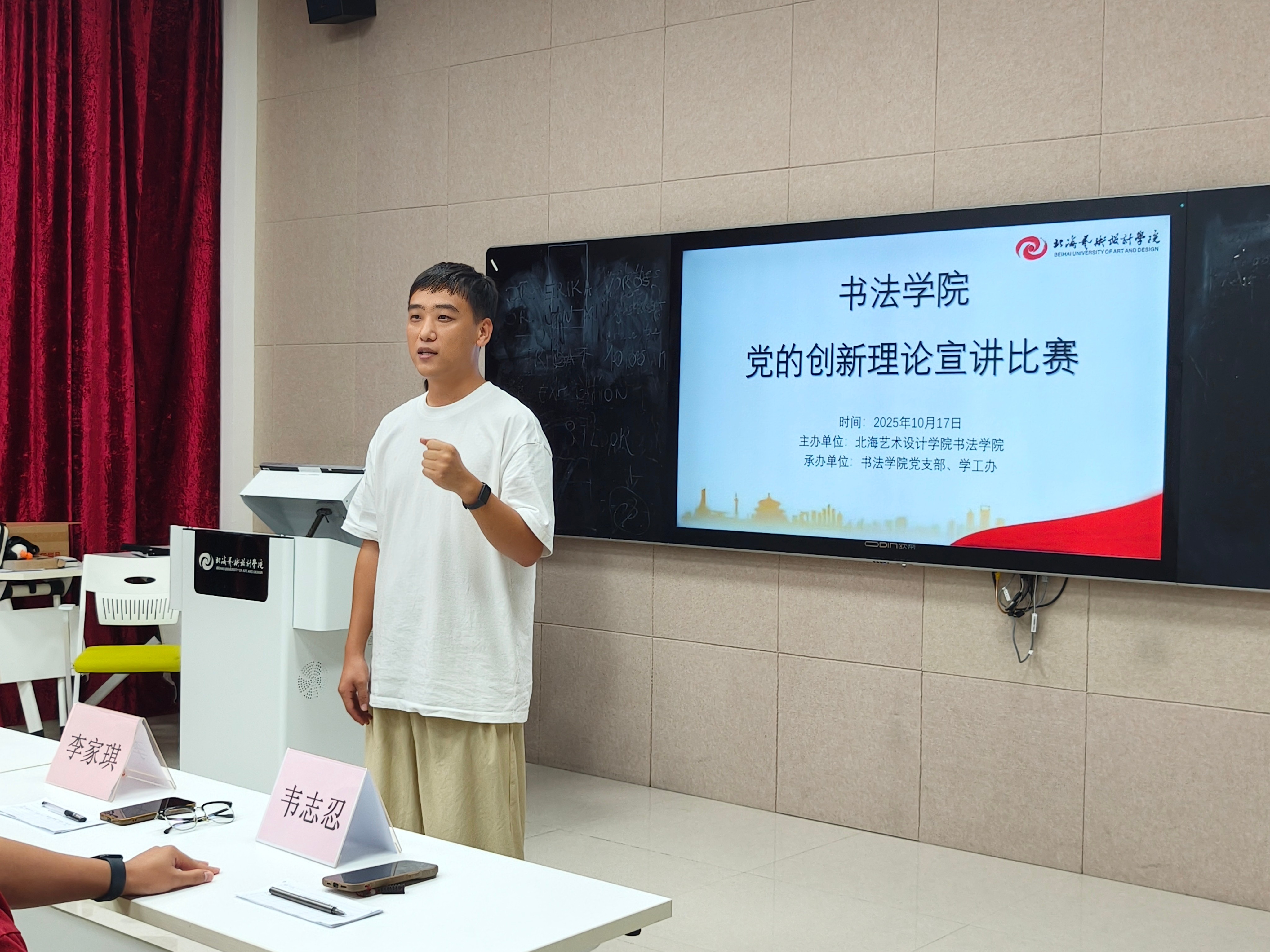 为扎实做好宣讲工作,持续推动党的创新理论入脑入心,1017日,书法学院在西校区图书馆智慧教室506开展党的创新理论宣讲比赛。学院党支部副书记左云飞、副院长李家琪、韦志忍、黄荣婷出席活动并担任评委。