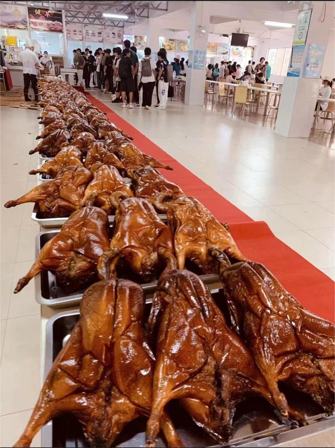 疫情期间,为了给封闭管理中的学生改善伙食,学校于4月12日在食堂开始免费为全校学生发放烧鹅。(图片来源:食堂)