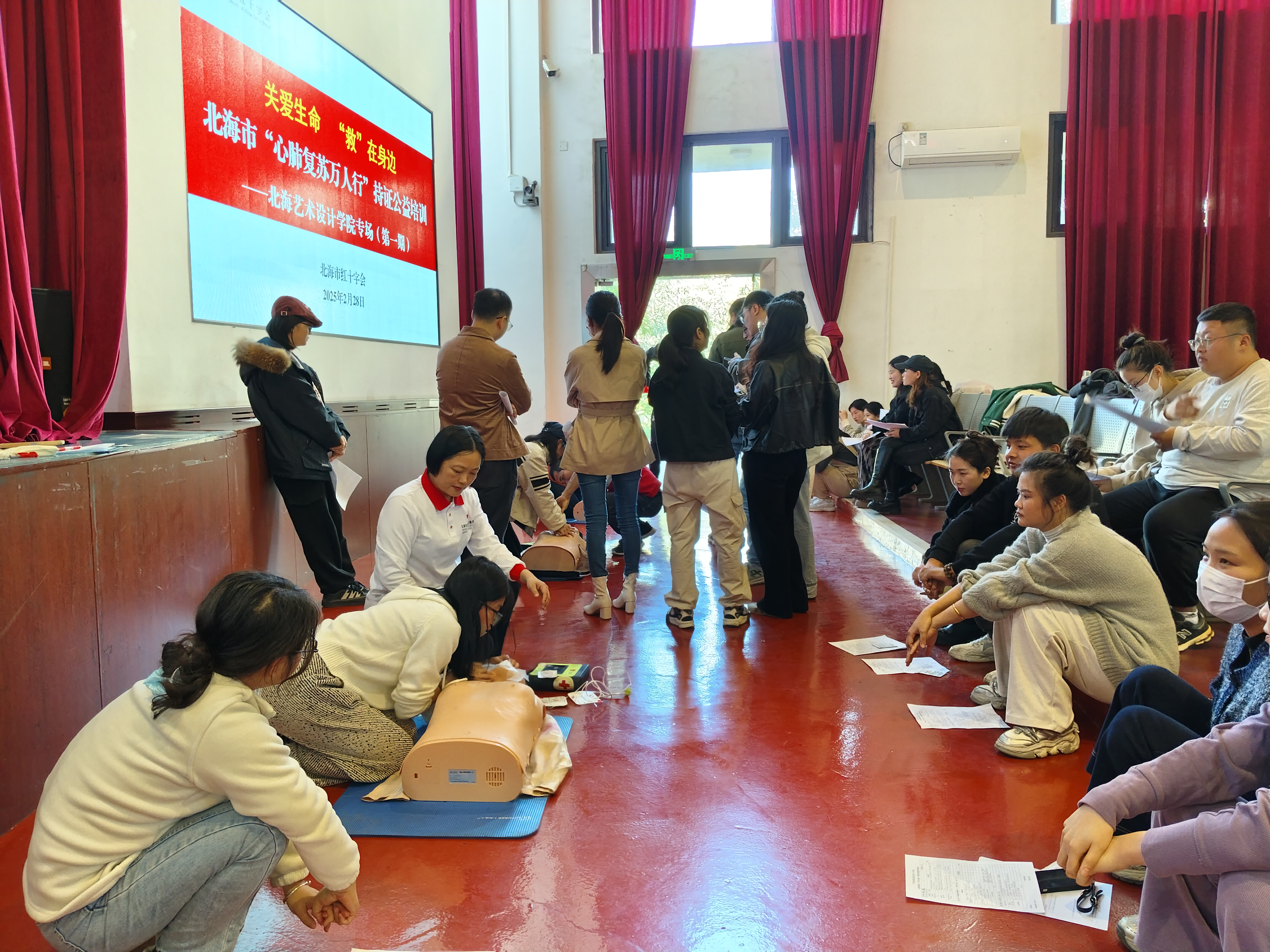 为提升学校师生应急处置能力,普及应急救护知识,增强安全防范意识,2025年2月28日-3月7日期间,校医务室联合北海市红十字会在校内举办了三期“心肺复苏万人行”公益培训活动。