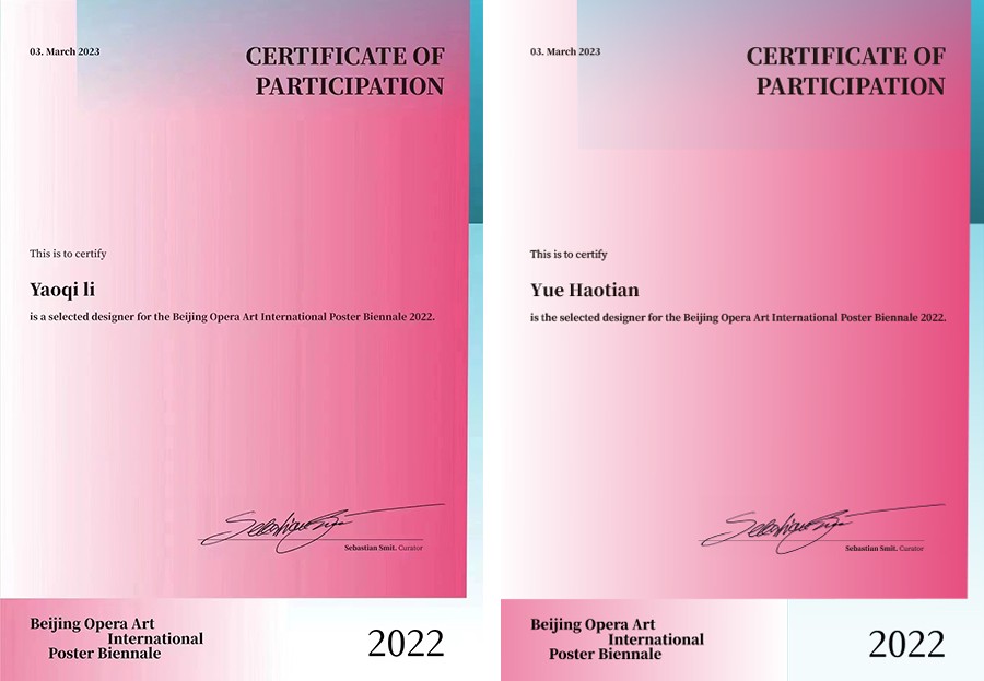 2022首届京剧艺术国际海报双年展评审工作已圆满收官,自展览开启作品征集以来,共收到来自中外34个国家和地区的1196位设计师的平面及动态海报作品。组委会邀请了来自图形艺术、海报设计、京剧表演、艺术出版不同领域的知名艺术家和从业者担任终评评委,从多维角度评选入选作品。在此次展览作品征集中,我院视觉传达设计专业2019级学生岳浩田、李耀桤的设计作品入围,作品于3月7日,在波兰华沙Retroavangarda美术馆展出!