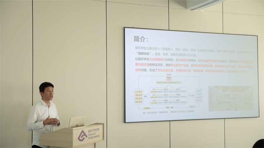 白建强副院长围绕设计艺术学院近年来的教学改革进行了主题为“文化文创文旅、共情共鸣共享‘双侧体验’艺术设计类人才培养模式实践”的汇报。他特别强调了“情感体验”在艺术创作中的重要性,并呼吁要更多关注区域民族文化的传承和创新。他表示,人工智能正在改变设计教育的传统模式,但真正的艺术设计不仅仅是要考虑技术,更多的是注重情感和人文价值。