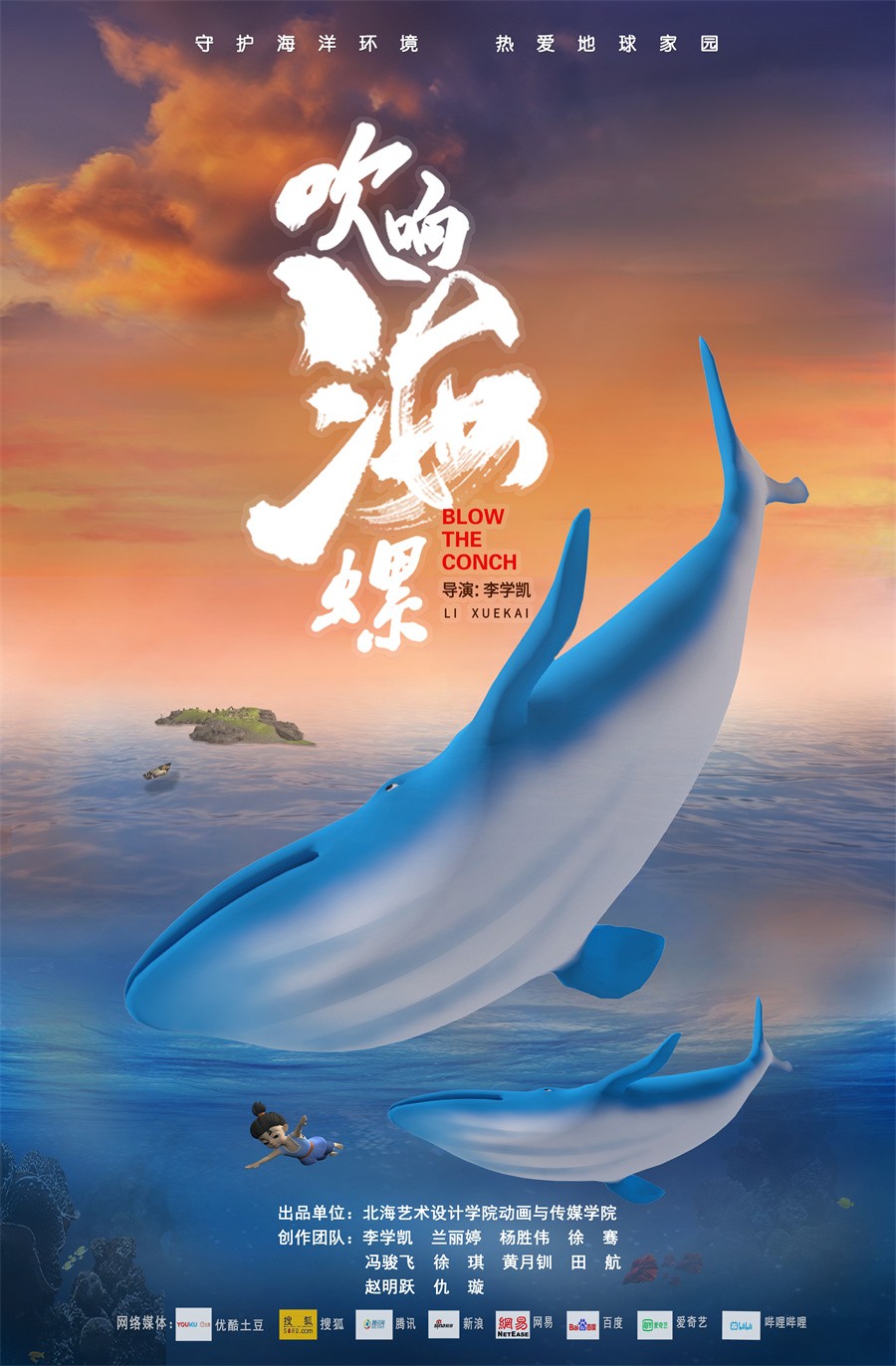 今日,由北海艺术设计学院动画与传媒学院大四学生创作的三维动画短片《吹响海螺》正式上线。该片展示了动画与传媒学院动画专业学生在动画艺术创作实力,更以独特的艺术视角和深邃的海洋情怀,为北海市打造“鲸鱼(布氏鲸)之乡”的新名片注入了文化动力。