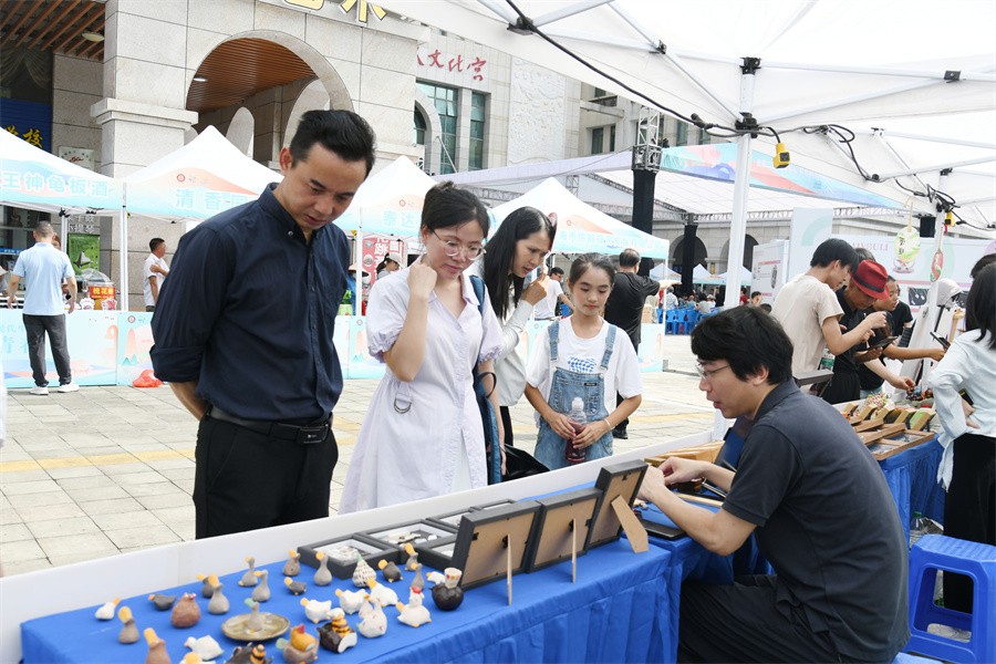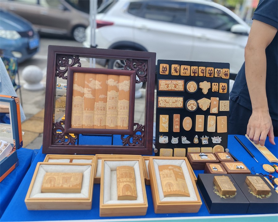 作为此次活动的重头戏之一,现场设置的非遗集市人头攒动、热闹非凡。在非遗集市展上,琳琅满目的手工艺品吸引了众多观众驻足欣赏,我校师生作品也得到了广泛关注。设计艺术学院实物组工艺美术类作品《北海有礼留青竹刻挂饰》与《北海贝雕益智拼图冰箱贴》在集市中进行了精彩的交流与宣传展示,作品融合了北海本土非遗技艺与现代设计美学的作品,生动诠释了文化传承与创新设计的魅力,获得了现场观众的一致好评。