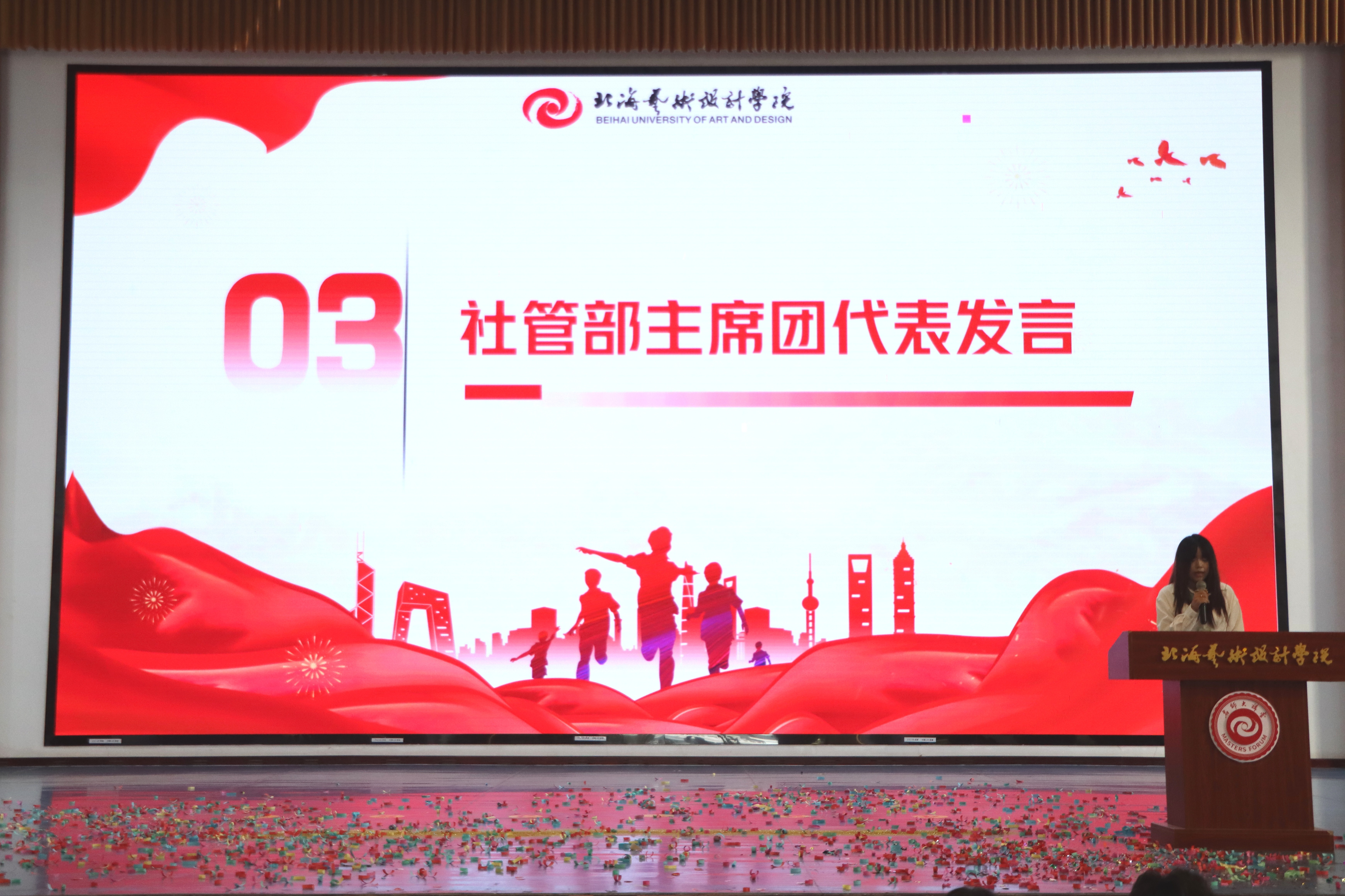 3月21日,北海艺术设计学院第二十一届社团文化节开幕式在大礼堂顺利举行 。本次文化节以“五彩绘青春、社团聚精彩”为主题,旨在展现丰富多彩的校园社团文化,为北艺学子们搭建青春风采的展示舞台。党委副书记彭仁、团委书记唐良春携校团委及分团委教师代表出席活动,与同学们共同见证这场文化盛宴。